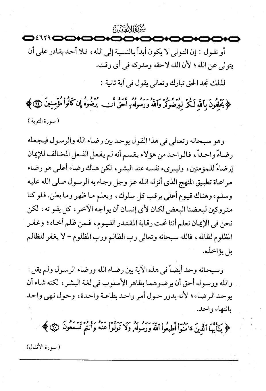 وهو سبحانه وتعالى في هذا القول يوحد بين رضاء الله والرسول فيجعله رضاءً واحداً، فالواحد من هؤلاء يقسم أنه لم يفعل الفعل المخالف للإيمان إرضاءً للمؤمنين، وليبرىء نفسه عند البشر، لكن هناك رضاء أعلى هو رضاء مراعاة تطبيق المنهج الذي أنزله الله عَزَّ وَجَلَّ وجاء به الرسول صَلَّى اللَّهُ عَلَيْهِ وَسَلَّم َ، وهناك قيوم أعلى يرقب كل سلوك، ويعلم ما ظهر وما بطن. فلو كنا متروكين لبعضنا البعض لكان لأي إنسان أن يواجه الآخر، كل بقوته، لكن نحن في الإيمان نعلم أننا تحت رقابة المقتدر القيوم، فمن ظلم أخاه؛ وغفر المظلوم لظالمه، فالله سبحانه وتعالى رب الظالم ورب المظلوم - لا يغفر للظالم بل يؤاخذه.