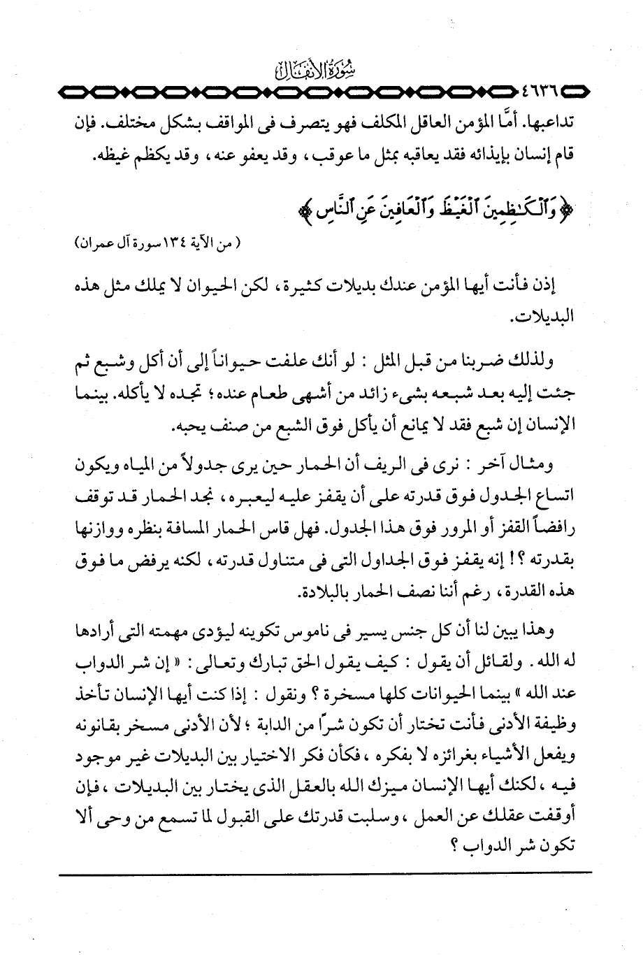 تداعبها. أمَّا المؤمن العاقل المكلف فهو يتصرف في المواقف بشكل مختلف. فإن قام إنسان بإيذائه فقد يعاقبه بمثل ما عوقب، وقد يعفو عنه، وقد يكظم غيظه. {والكاظمين الغيظ والعافين عَنِ الناس} [آل عمران: 134] .