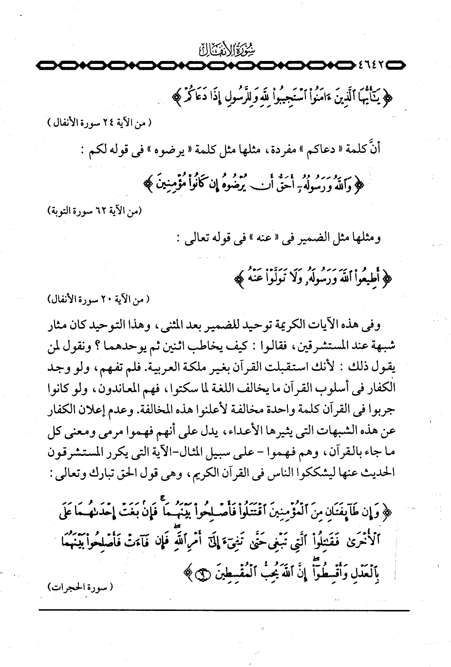 وفي هذه الآيات الكريمة توحيد للضمير بعد المثنى، وهذا التوحيد كان مثار شبهة عند المستشرقين، فقالوا: كيف يخاطب اثنين ثم يوحدهما؟ ونقول لمن يقول ذلك: لأنك استقبلت القرآن بغير ملكة العربية. فلم تفهم، ولو وجد الكفار في أسلوب القرآن ما يخالف اللغة لما سكتوا، فهم المعاندون، ولو كانوا جربوا في القرآن كلمة واحدة مخالفة لأعلنوا هذه المخالفة. وعدم إعلان الكفار عن هذه الشبهات التي يثيرها الأعداء، يدل على أنهم فهموا مرمى ومعنى كل ما جاء بالقرآن، وهم فهموا - على سبيل المثال - الآية التي يكرر المستشرقون الحديث عنها ليشككوا الناس في القرآن الكريم، وهي قول الحق تبارك وتعالى: {وَإِن طَآئِفَتَانِ مِنَ المؤمنين اقتتلوا فَأَصْلِحُواْ بَيْنَهُمَا فَإِن بَغَتْ إِحْدَاهُمَا على الأخرى فَقَاتِلُواْ التي تَبْغِي حتى تفياء إلى أَمْرِ الله فَإِن فَآءَتْ فَأَصْلِحُواْ بَيْنَهُمَا بالعدل وأقسطوا إِنَّ الله يُحِبُّ المقسطين} [الحجرات: 9] .