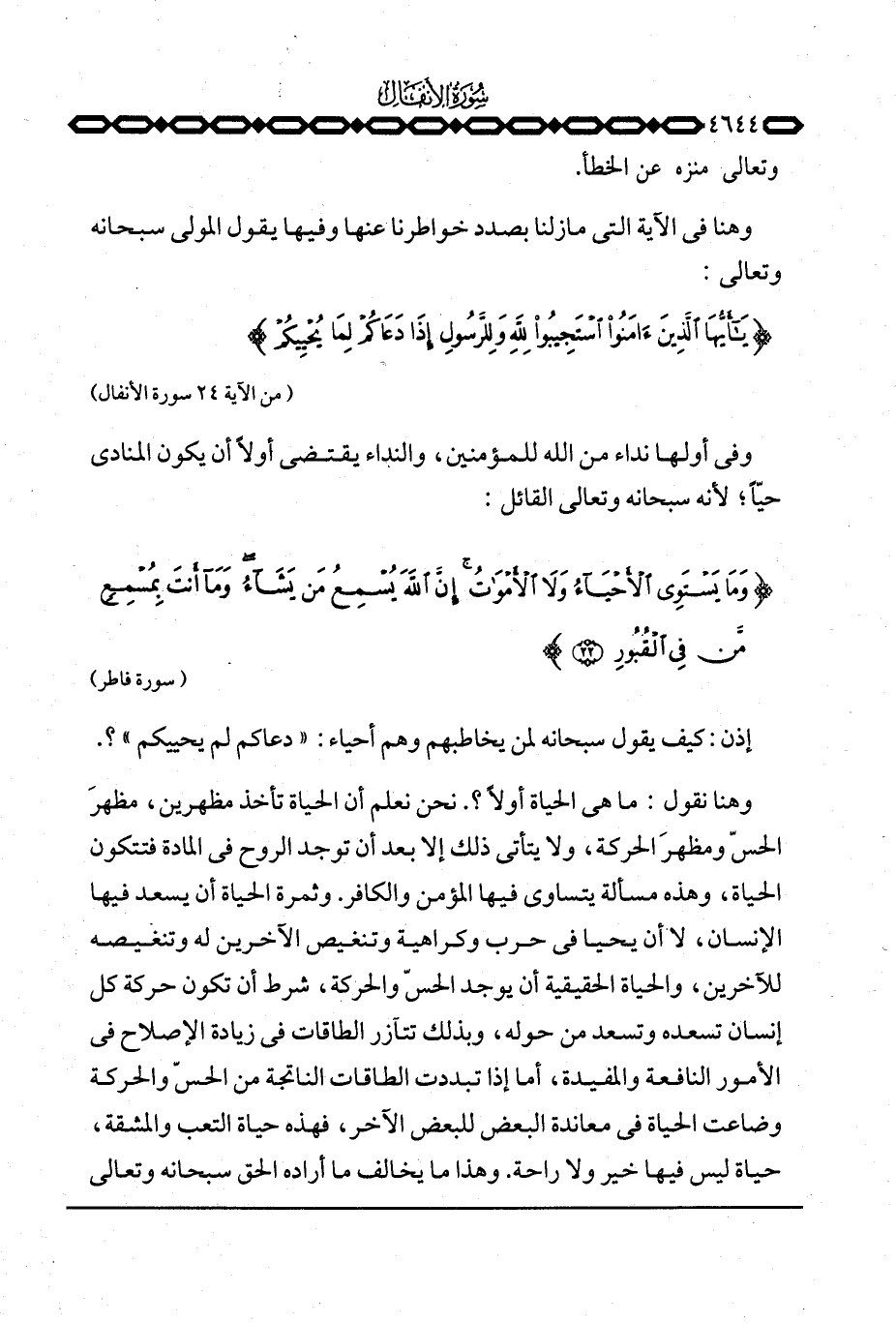 وفي أولها نداء من الله للمؤمنين، والنداء يقتضي أولاً أن يكون المنادى حيّاً؛ لأنه سبحانه وتعالى القائل: {وَمَا يَسْتَوِي الأحيآء وَلاَ الأموات إِنَّ الله يُسْمِعُ مَن يَشَآءُ وَمَآ أَنتَ بِمُسْمِعٍ مَّن فِي القبور} [فاطر: 22] .
