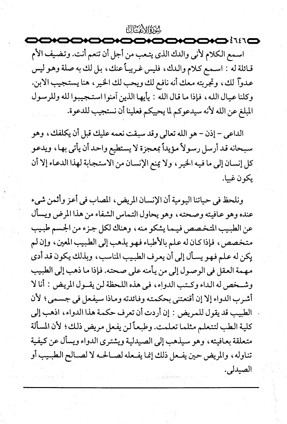 ونلحظ في حياتنا اليومية أن الإنسان المريض، المصاب في أعز وأثمن شيء عنده وهو عافيته وصحته، وهو يحاول التماس الشفاء من هذا المرض ويسأل عن الطبيب المتخصص فيما يشكو منه، وهناك لكل جزء من الجسم طبيب متخصص، فإذا كان له علم بالأطباء فهو يذهب إلى الطبيب المعين، وإن لم يكن له علم فهو يسأل إلى أن يعرف الطبيب المناسب، وبذلك يكون قد أدى مهمة العقل في الوصول إلى من يأمنه على صحته. فإذا ما ذهب إلى الطبيب وشخص له الداء وكتب الدواء، في هذه اللحظة لن يقول المريض: أنا لا أشرب الدواء إلا إن أقنعتني بحكمته وفائدته وماذا سيفعل في جسمي؛ لأن الطبيب قد يقول للمريض: إن أردت أن تعرف حكمة هذا الدواء، اذهب إلى كلية الطب لتتعلم مثلما تعلمت. وطبعاً لن يفعل مريض ذلك؛ لأن المسألة متعلقة بعافيته، وهو سيذهب إلى الصيدلية ويشتري الدواء ويسأل عن كيفية تناوله، والمريض حين يفعل ذلك إنما يفعله لصالحه لا لصالح الطبيب أو الصيدلي.
