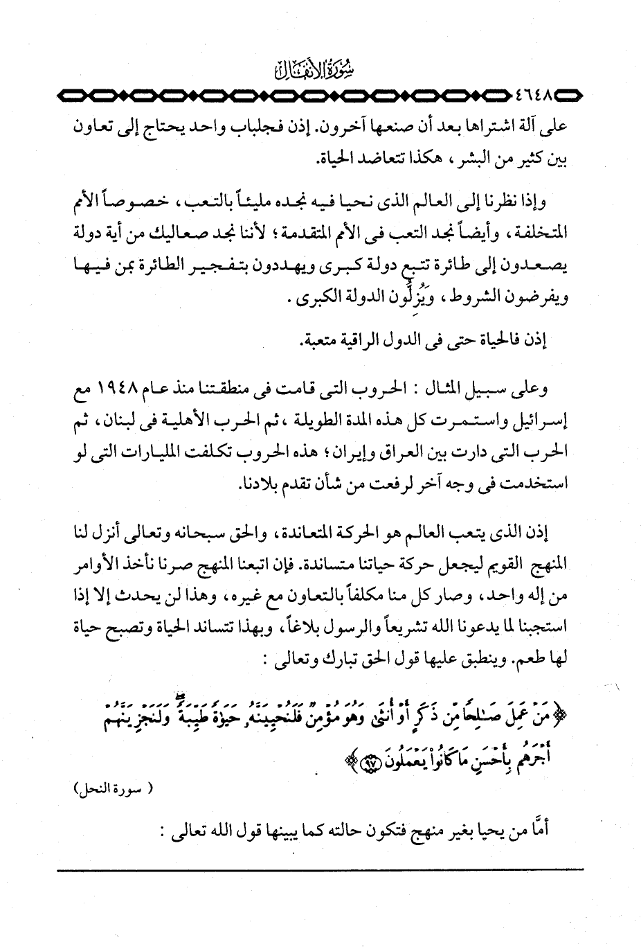 إذن الذي يتعب العالم هو الحركة المتعاندة، والحق سبحانه وتعالى أنزل لنا المنهج القويم ليجعل حركة حياتنا متساندة. فإن اتبعنا المنهج صرنا نأخذ الأوامر من إله واحد، وصار كل منا مكلفاً بالتعاون مع غيره، وهذا لن يحدث إلا إذا استجبنا لما يدعونا الله تشريعاً والرسول بلاغاً، وبهذا تتساند الحياة وتصبح حياة لها طعم. وينطبق عليها قول الحق تبارك وتعالى: {مَنْ عَمِلَ صَالِحاً مِّن ذَكَرٍ أَوْ أنثى وَهُوَ مُؤْمِنٌ فَلَنُحْيِيَنَّهُ حَيَاةً طَيِّبَةً وَلَنَجْزِيَنَّهُمْ أَجْرَهُم بِأَحْسَنِ مَا كَانُواْ يَعْمَلُونَ} [النحل: 97] .