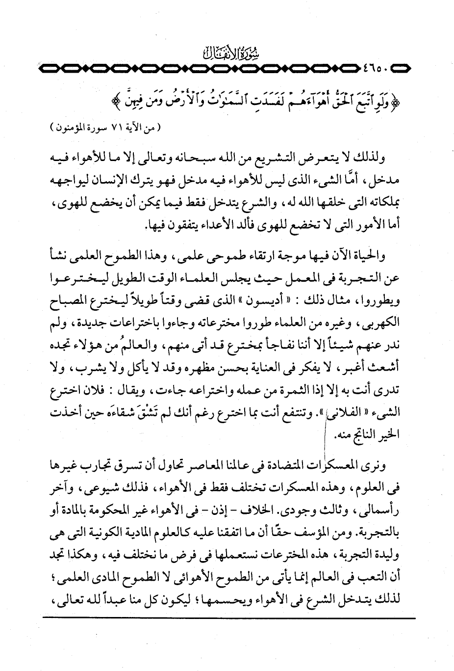 ونرى المعسكرات المتضادة في عالمنا المعاصر تحاول أن تسرق تجارب غيرها في العلوم، وهذه المعسكرات تختلف فقط في الأهواء، فذلك شيوعي، وآخر رأسمالي، وثالث وجودي. الخلاف - إذن - في الأهواء غير المحكومة بالمادة أو بالتجربة. ومن المؤسف حقًا أن ما اتفقنا عليه كالعلوم المادية الكونية التي هي وليدة التجربة، هذه المخترعات نستعملها في فرض ما نختلف فيه، وهكذا تجد أن التعب في العالم إنما يأتي من الطموح الأهوائي لا الطموح المادي العلمي؛ لذلك يتدخل الشرع في الأهواء ويحسمها؛ ليكون كل منا عبداً لله تعالى،
