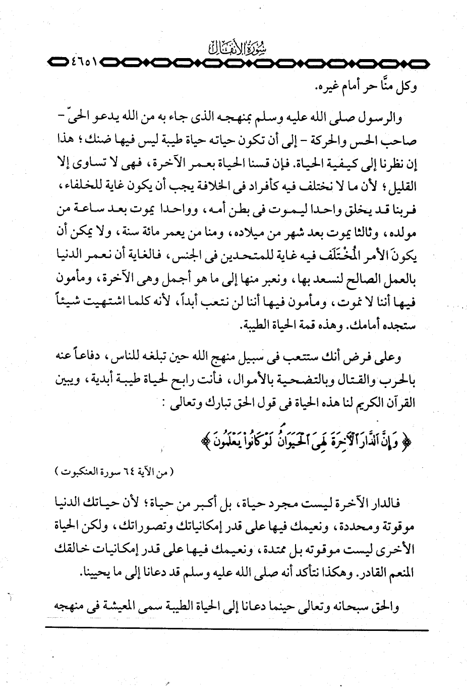 وعلى فرض أنك ستتعب في سبيل منهج الله حين تبلغه للناس، دفاعاً عنه بالحرب والقتال وبالتضحية بالأموال، فأنت رابح لحياة طيبة أبدية، ويبين القرآن الكريم لنا هذه الحياة في قول الحق تبارك وتعالى: