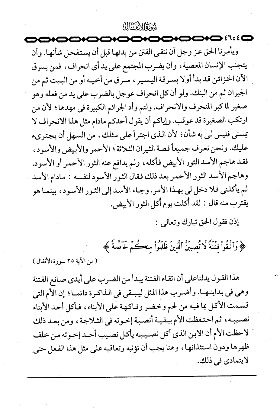 ويأمرنا الحق عَزَّ وَجَلَّ أن نتقي الفتن من بدئها قبل أن يستفحل شأنها. وأن يتجنب الإنسان المعصية، وأن يضرب المجتمع على يد أي انحراف، فمن يسرق الآن الخزائن قد بدأ أولا بسرقة اليسير، سرق من أخيه أو من البيت ثم من الجيران ثم من البنك. ولو أن كل انحراف عوجل بالضرب على يد من فعله وهو صغير لما كبر المنحرف والانحراف. ولتم وأد الجرائم الكبيرة في مهدها؛ لأن من ارتكب الصغيرة قد عوقب. وإياكم أن يقول أحدكم ما دام مثل هذا الانحراف لا يمسني فليس لي به شأن؛ لأن الذي اجترأ على مثلك، من السهل أن يجترىء عليك. ونحن نعرف جميعاً قصة الثيران الثلاثة؛ الأحمر والأبيض والأسود، فقد هاجم الأسد الثور الأبيض فأكله، ولم يدافع عنه الثور الأحمر أو الأسود. وهاجم الأسد الثور الأحمر بعد ذلك فقال الثور الأسود لنفسه: ما دام الأسد لم يأكلني فلا دخل لي بهذا الأمر. وجاء الأسد إلى الثور الأسود، بينما هو يقترب منه قال: لقد أُكلت يوم أُكل الثور الأبيض.