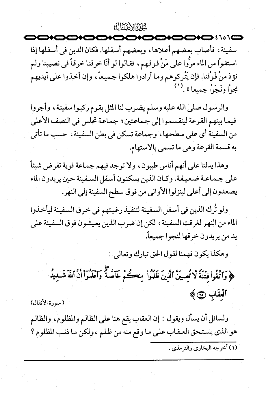 سفينة، فأصاب بعضهم أعلاها، وبعضهم أسفلها. فكان الذين في أسفلها إذا استقوْا من الماء مرُّوا على مَنْ فوقهم، فقالوا لو أنّا خرقنا خرقاً في نصيبنا ولم نؤذ منْ فَوْقنا. فإن يَتْركوهم وما أرادوا هلكوا جميعاً، وإن أخذوا على أيديهم نجوْا ونَجَوْا جميعا» .
