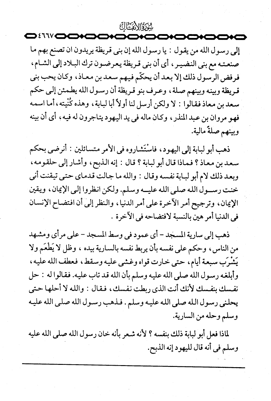 إلى رسول الله من يقول: يا رسول الله إن بني قريظة يريدون ان تصنع بهم ما صنعته مع بني النضير، أي أن بني قريظة يعرضون ترك البلاد إلى الشام، فرفض الرسول ذلك إلا بعد أن يحكّم فيهم سعد بن معاذ، وكان يحب بني قريظة وبينه وبينهم صلة، وعرف بنو قريظة أن رسول الله يطمئن إلى حكم سعد بن معاذ فقالوا: لا ولكن أرسل لنا أولاً أبا لبابة، وهذه كُنْيته، أما اسمه فهو مروان بن عبد المنذر، وكان ماله في يد اليهود يتاجرون له فيه، أي أن بينه وبينهم صلةً مالية.