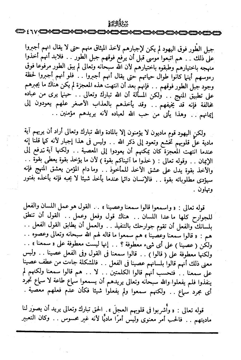 جبل الطور فوق اليهود لم يكن لإجبارهم لأخذ الميثاق منهم حتى لا يقال أنهم أجبروا على ذلك. . هم اتبعوا موسى قبل أن يرفع فوقهم جبل الطور. . فلابد أنهم أخذوا منهجه باختيارهم وطبقوه باختيارهم لأن الله سبحانه وتعالى لم يبق الطور مرفوعا فوق رءوسهم أينما كانوا طوال حياتهم حتى يقال أنهم أجبروا. . فلو أنهم أجبروا لحظة وجود جبل الطور فوقهم. . فإنهم بعد أن انتهت هذه المعجزة لم يكن هناك ما يجبرهم على تطبيق المنهج. . ولكن المسألة أن الله تبارك وتعالى. . حينما يرى من عباده مخالفة فإنه قد يخيفهم. . وقد يأخذهم بالعذاب الأصغر علهم يعودون إلى إيمانهم. . وهذا يأتي من حب الله لعباده لأنه يريدهم مؤمنين. .