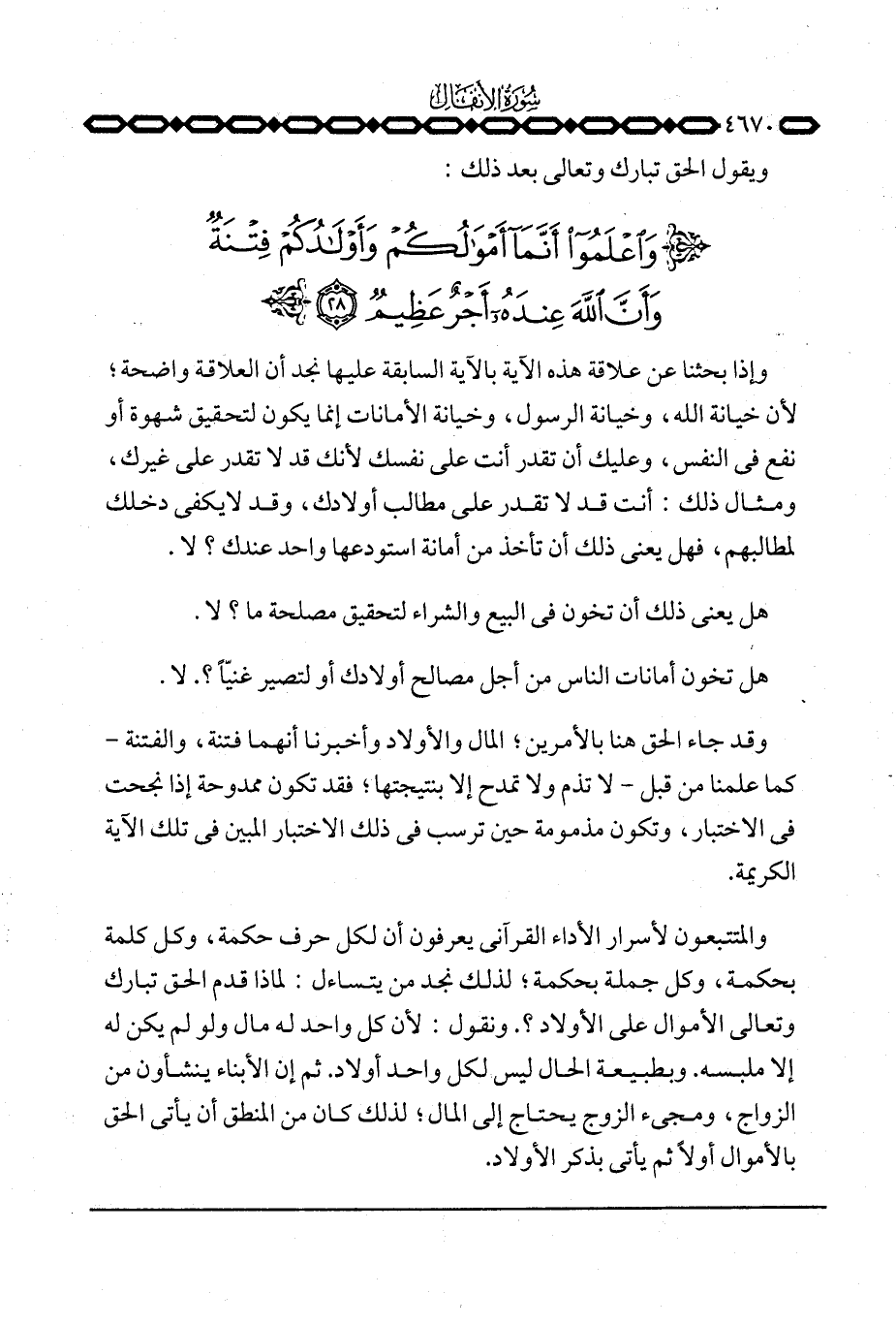 وإذا بحثنا عن علاقة هذه الآية بالآية السابقة عليها نجد أن العلاقة واضحة؛ لأن خيانة الله، وخيانة الرسول، وخيانة الأمانات إنما يكون لتحقيق شهوة أو نفع في النفس، وعليك أن تقدر أنت على نفسك لأنك قد لا تقدر على غيرك، ومثال ذلك: أنت قد لا تقدر على مطالب أولادك، وقد لا يكفي دخلك لمطالبهم، فهل يعني ذلك أن تأخذ من أمانة استودعها واحد عندك؟ لا.