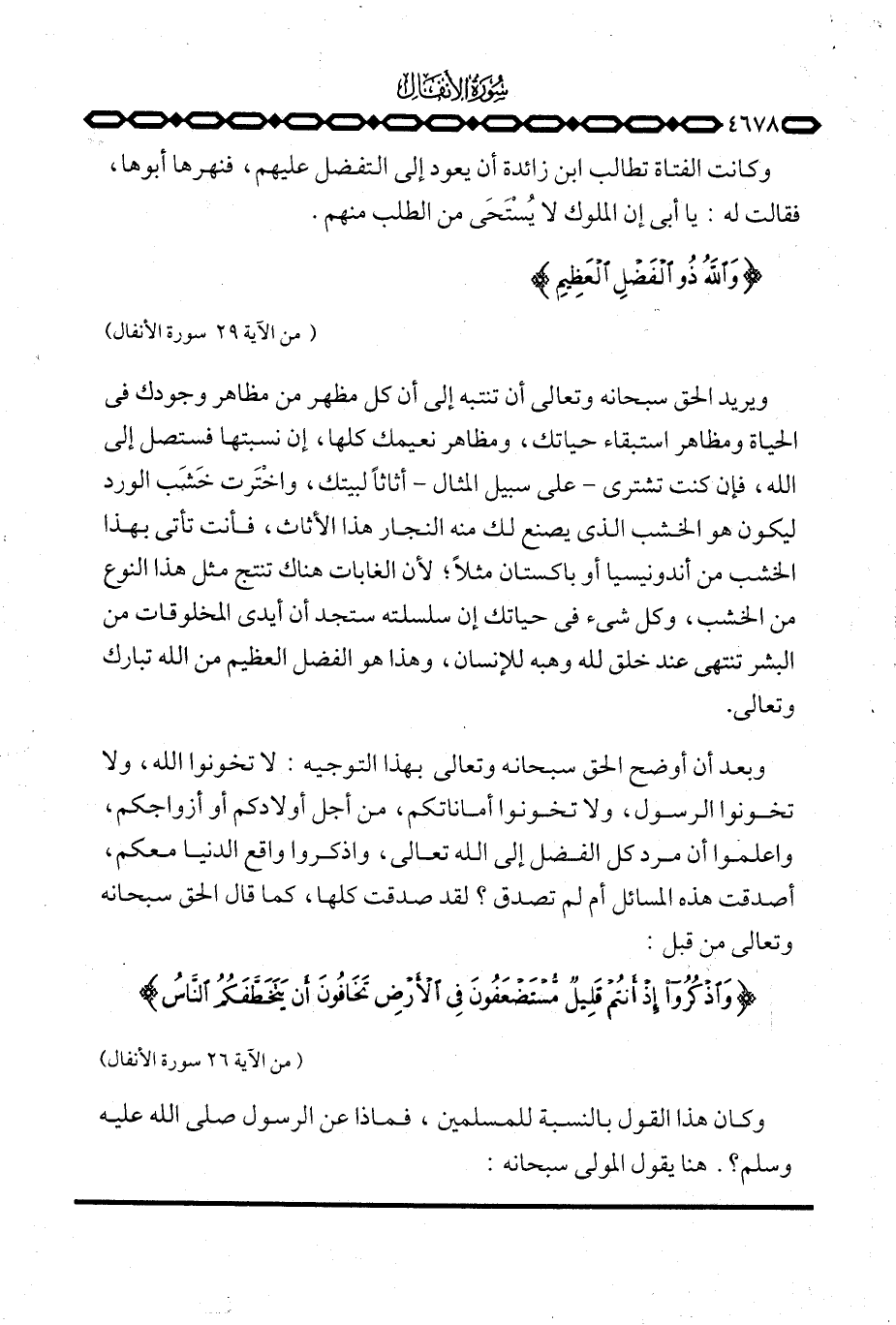 ويريد الحق سبحانه وتعالى أن تنتبه إلى أن كل مظهر من مظاهر وجودك في الحياة ومظاهر استبقاء حياتك، ومظاهر نعيمك كلها، إن نسبتها فستصل إلى الله، فإن كنت تشتري - على سبيل المثال - أثاثاً لبيتك، واخْتَرت خَشَب الورد ليكون هو الخشب الذي يصنع لك منه النجار هذا الأثاث، فأنت تأتي بهذا الخشب من أندونيسيا أو باكستان مثلاً؛ لأن الغابات هناك تنتج مثل هذا النوع من الخشب، وكل شيء في حياتك إن سلسلته ستجد أن أيدي المخلوقات من البشر تنتهي عند خلق لله وهبه للإنسان، وهذا هو الفضل العظيم من الله تبارك وتعالى.