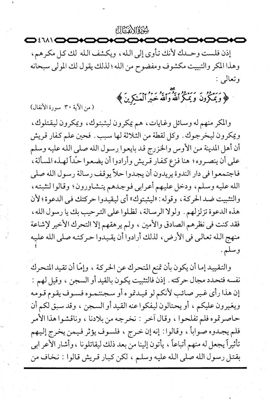 والتقييد إما أن يكون بأن تمنع المتحرك عن الحركة، وإمّا أن تقيد المتحرك نفسه فتحدد مجال حركته. إذن فالتثبيت يكون بالقيد أو السجن، وقيل لهم: إن هذا رأي غير صائب لأنكم لو قيدتموه أو سجنتموه فسوف يقوم قومه ويغيرون عليكم، أو يحتالون ليفكوا عنه القيد أو السجن، وقد سبق لكم أن حاصرتموه فلم تفلحوا، وقال آخر: نخرجه من بلادنا، وناقشوا هذا الأمر فلم يجدوه صواباً، وقالوا: إنه إن خرج، فلسوف يؤثر فيمن يخرج إليهم تأثيراً يجعل له منهم أتباعاً، يأتون إلينا من بعد ذلك ليقاتلونا، وأشار الأعرابي بقتل رسول الله صَلَّى اللَّهُ عَلَيْهِ وَسَلَّم َ، لكن كبار قريش قالوا: نخاف من