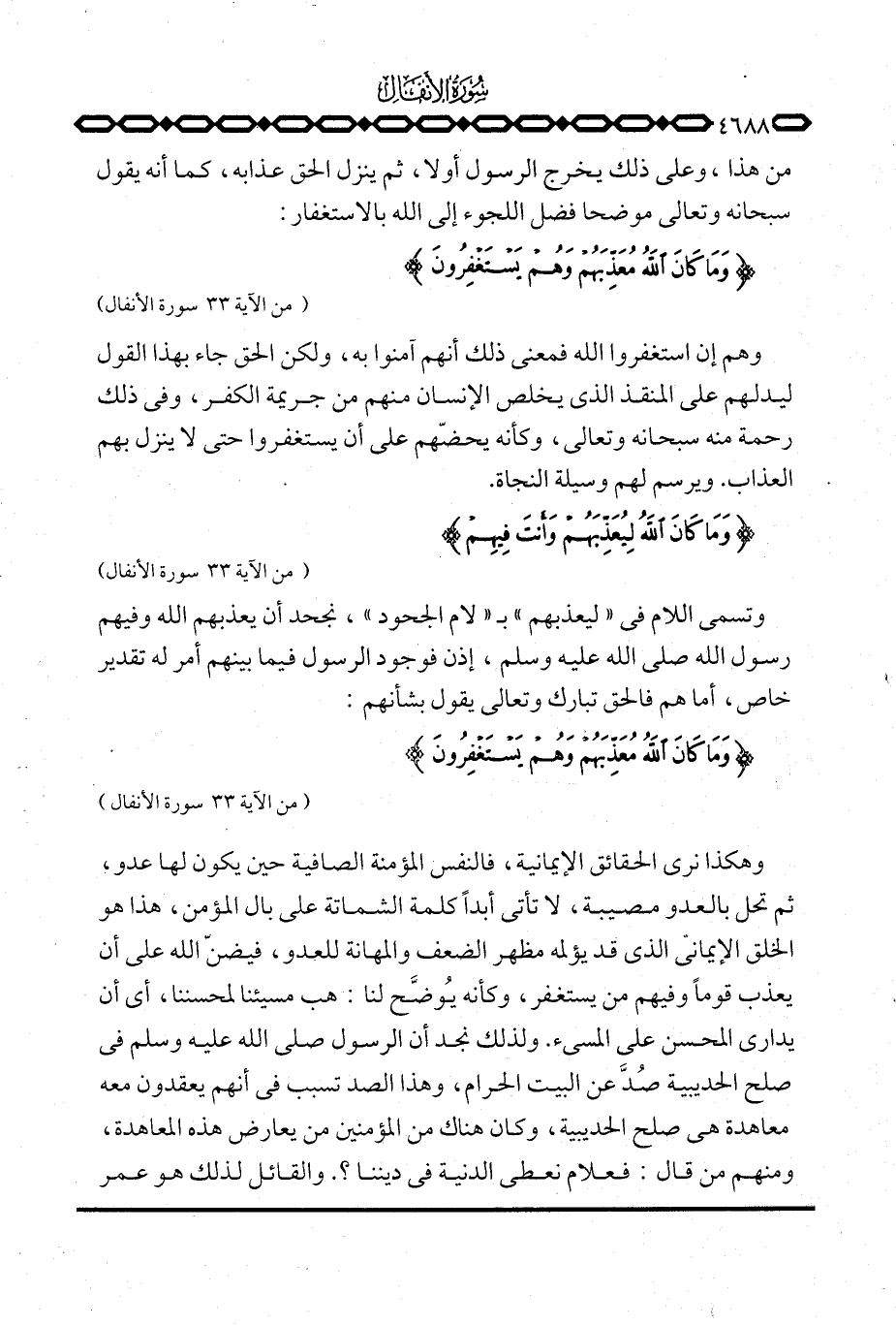 وهكذا نرى الحقائق الإيمانية، فالنفس المؤمنة الصافية حين يكون لها عدو، ثم تحل بالعدو مصيبة، لا تأتي أبداً كلمة الشماتة على بال المؤمن، هذا هو الخلق الإيماني الذي قد يؤلمه مظهر الضعف والمهانة للعدو، فيضنّ الله على أن يعذب قوماً وفيهم من يستغفر، وكأنه يُوضَّح لنا: هب مسيئنا لمحسننا، أي أن يداري المحسن على المسيء. ولذلك نجد «أن الرسول صَلَّى اللَّهُ عَلَيْهِ وَسَلَّم َ في صلح الحديبية صُدَّ عن البيت الحرام، وهذا الصد تسبب في أنهم يعقدون معه معاهدة هي صلح الحديبية، وكان هناك من المؤمنين من يعارض هذه المعاهدة، ومنهم من قال: فعلام نعطي الدنية في ديننا؟ . والقائل لذلك هو عمر