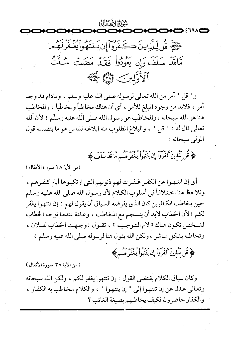 أي إن انتهوا عن الكفر غفرت لهم ذنوبهم التي ارتكبوها أيام كفرهم، ونلاحظ هنا اختلافاً في أسلوب الكلام لأن رسول الله صَلَّى اللَّهُ عَلَيْهِ وَسَلَّم َ حين يخاطب الكافرين كان الذي يفرضه السياق أن يقول لهم: إن تنتهوا يغفر لكم؛ لأن الخطاب لا بد أن ينسجم مع المخاطب، وعادة عندما توجه الخطاب لشخص تكون هناك «لام التوجيه» ، تقول: وجهت الخطاب لفلان، وتخاطبه بشكل مباشر، ولكن الله يقول هنا لرسوله صَلَّى اللَّهُ عَلَيْهِ وَسَلَّم َ: