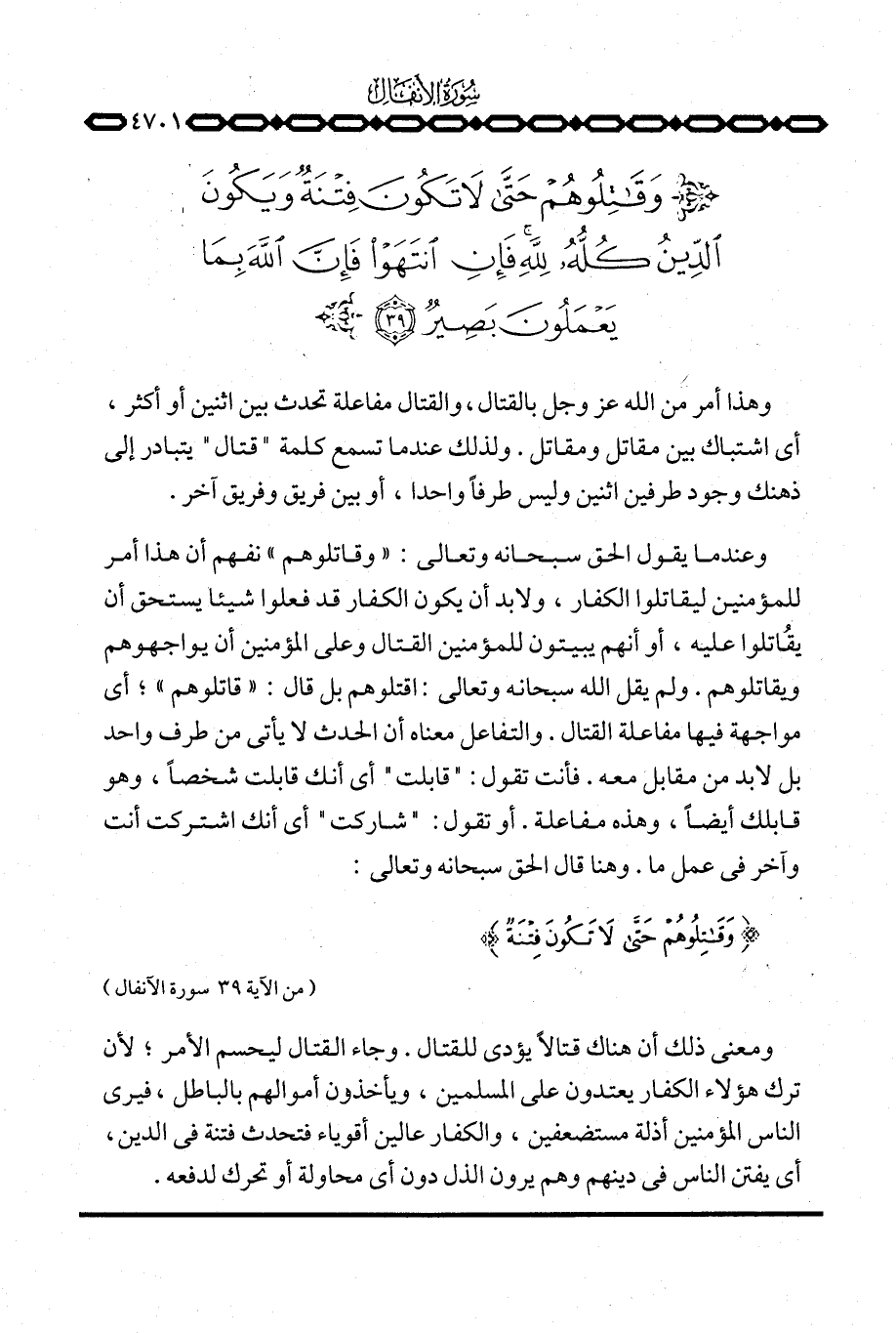 وهذا أمر من الله عَزَّ وَجَلَّ بالقتال، والقتال مفاعلة تحدث بين اثنين أو أكثر، أي اشتباك بين مقاتل ومقاتل. ولذلك عندما تسمع كلمة «قتال» يتبادر إلى ذهنك وجود طرفين اثنين وليس طرفاً واحدا، أو بين فريق وفريق آخر.