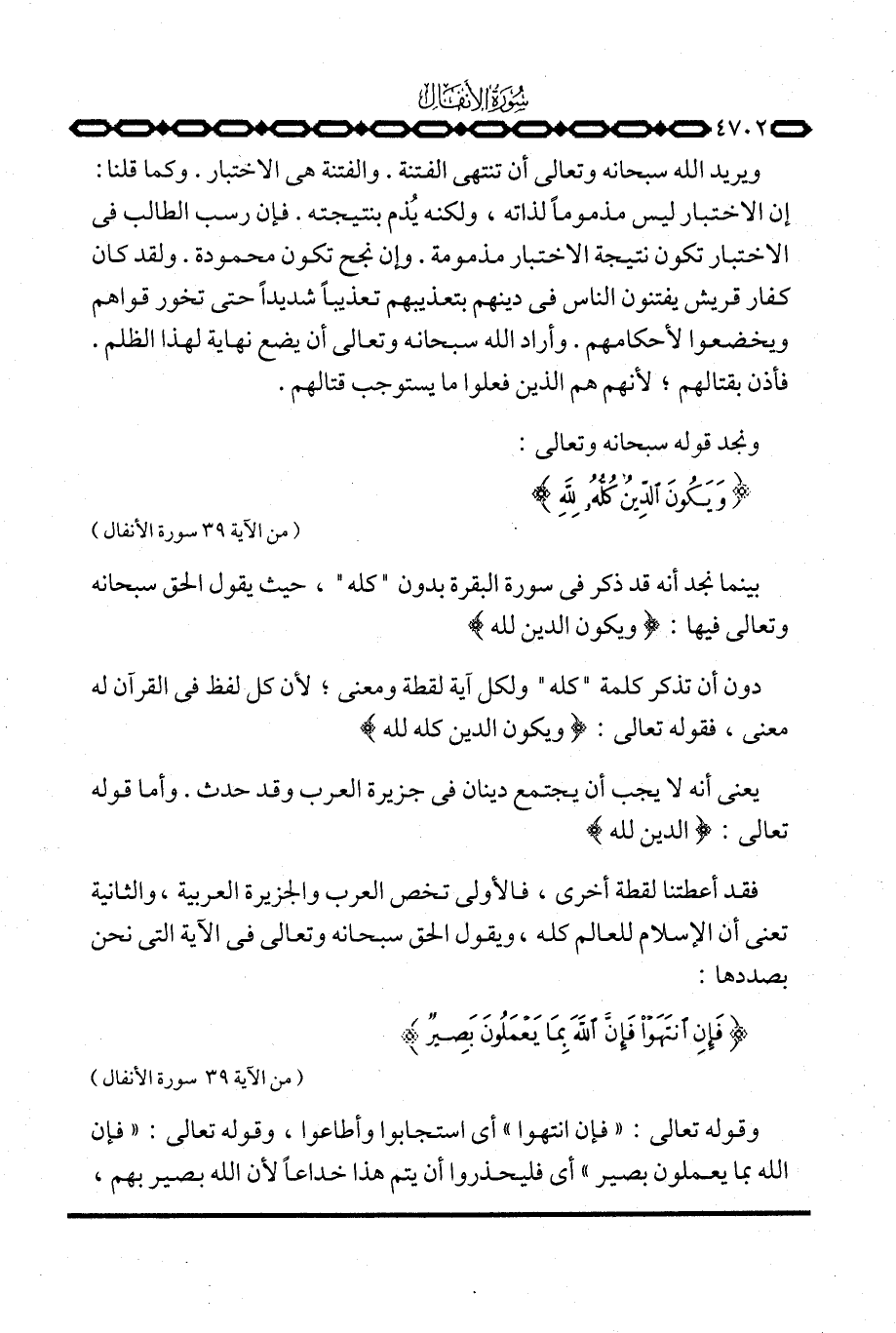 ويريد الله سبحانه وتعالى أن تنتهي الفتنة. والفتنة هي الاختبار. وكما قلنا: إن الاختبار ليس مذموماً لذاته، ولكنه يُذم بنتيجته. فإن رسب الطالب في الاختيار تكون نتيجة الاختيار مذمومة. وإن نجح تكون محمودة. ولقد كان كفار قريش يفتنون الناس في دينهم بتعذيبهم تعذيباً شديداً حتى تخور قواهم ويخضعوا لأحكامهم. وأراد الله سبحانه وتعالى أن يضع نهاية لهذا الظلم. فإذن بقتالهم؛ لأنهم هم الذين فعلوا ما يستوجب قتالهم.