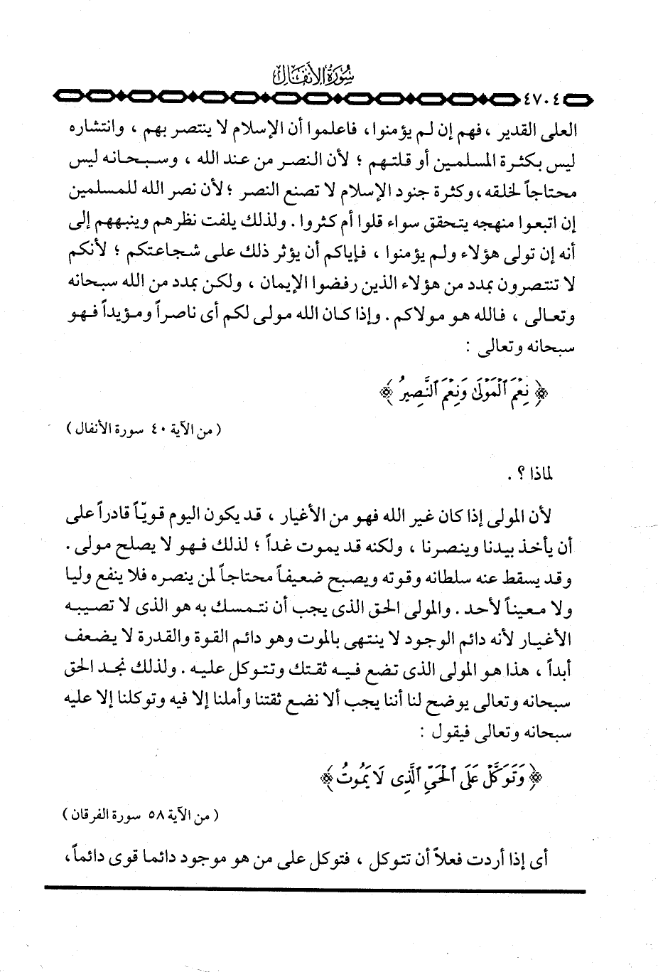 لأن المولى إذا كان غير الله فهو من الأغيار، قد يكون اليوم قويّاً قادراً على أن يأخذ بيدنا وينصرنا، ولكنه قد يموت غداً؛ لذلك فهو لا يصلح مولى. وقد يسقط عنه سلطانه وقوته ويصبح ضعيفاً محتاجاً لمن ينصره فلا ينفع وليا ولا معيناً لأحد. والمولى الحق الذي يجب أن نتمسك به هو الذي لا تصيبه الأغيار لأنه دائم الوجود لا ينتهي بالموت وهو دائم القوة والقدرة لا يضعف أبداً، هذا هو المولى الذي تضع فيه ثقتك وتتوكل عليه. ولذلك نجد الحق سبحانه وتعالى يوضح لنا أننا يجب ألا نضع ثقتنا وأملنا إلا فيه وتوكلنا إلا عليه سبحانه وتعالى فيقول: {وَتَوَكَّلْ عَلَى الحي الذي لاَ يَمُوتُ} [الفرقان: 58] .