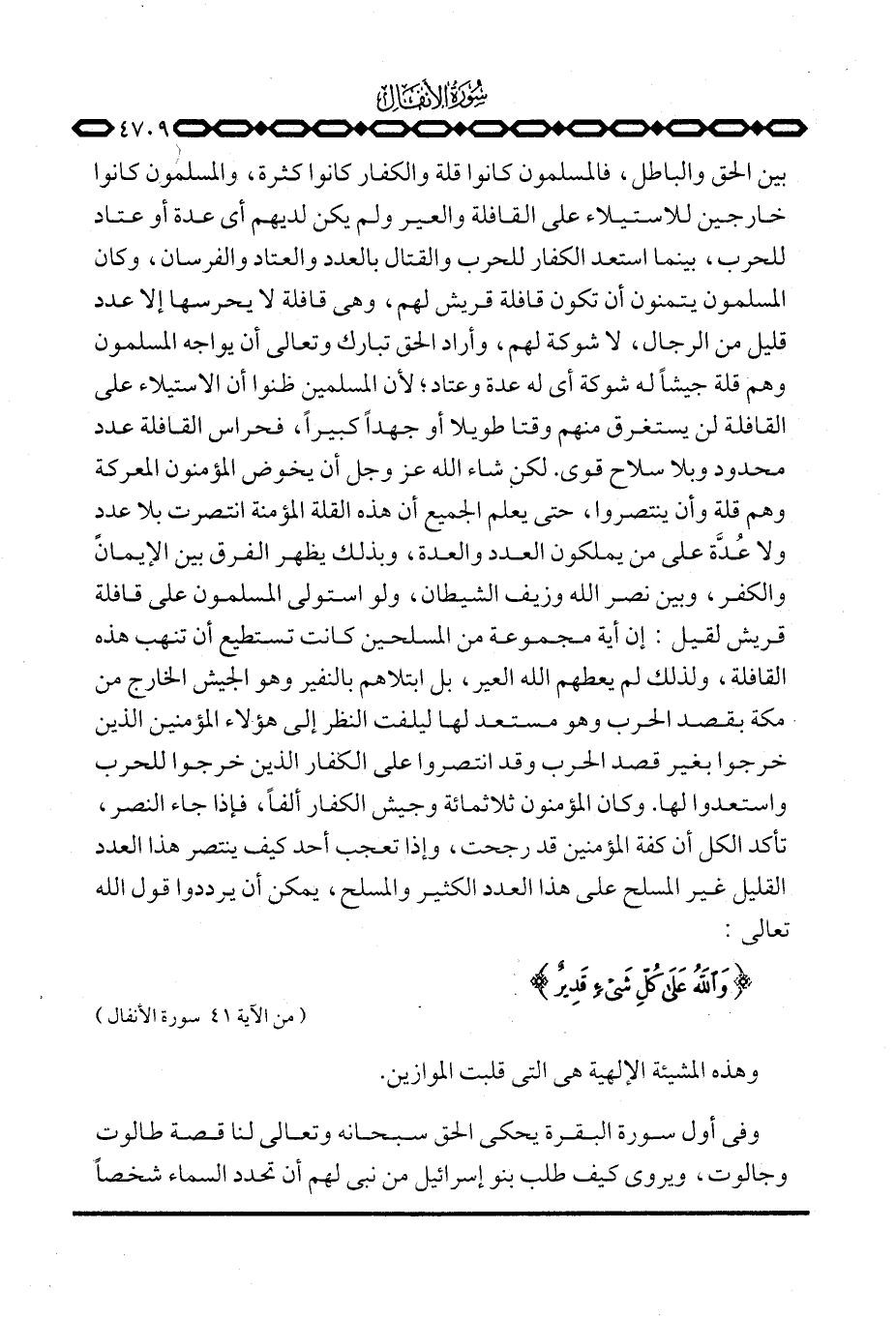بين الحق والباطل، فالمسلمون كانوا قلة والكفار كانوا كثرة، والمسلمون كانوا خارجين للاستيلاء على القافلة والعير ولم يكن لديهم أي عدة أو عتاد للحرب، بينما استعد الكفار للحرب والقتال بالعدد والعتاد والفرسان، وكان المسلمون يتمنون أن تكون قافلة قريش لهم، وهي قافلة لا يحرسها إلا عدد قليل من الرجال، لا شوكة لهم، وأراد الحق تبارك وتعالى أن يواجه المسلمون وهم قلة جيشاً له شوكة أي له عدة وعتاد؛ لأن المسلمين ظنوا أن الاستيلاء على القافلة لن يستغرق منهم وقتا طويلا أو جهداً كبيراً، فحراس القافلة عدد محدود وبلا سلاح قوي. لكن شاء الله عَزَّ وَجَلَّ أن يخوض المؤمنون المعركة وهم قلة وأن ينتصروا، حتى يعلم الجميع أن هذه القلة المؤمنة انتصرت بلا عددٍ ولا عُدَّة على من يملكون العدد والعدة، وبذلك يظهر الفرق بين الإيمان والكفر، وبين نصر الله وزيف الشيطان، ولو استولى المسلمون على قافلة قريش لقيل: إن أية مجموعة من المسلحين كانت تستطيع أن تنهب هذه القافلة، ولذلك لم يعطهم الله العير بل ابتلاهم بالنفير وهو الجيش الخارج من مكة بقصد الحرب وهو مستعد لها ليلفت النظر إلى هؤلاء المؤمنين الذين خرجوا بغير قصد الحرب وقد انتصروا على الكفار الذين خرجوا للحرب واستعدوا لها.