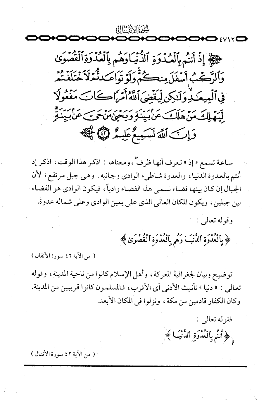 ساعة تسمع «إذ» تعرف أنها ظرفٌ، ومعناها: اذكر هذا الوقت، اذكر إذ أنتم بالعدوة الدنيا، والعدوة شاطيء الوادي وجانبه. وهي جبل مرتفع؛ لأن الجبال إن كان بينها فضاء نسمي هذا الفضاء وادياً، فيكون الوادي هو الفضاء بين جبلين، ويكون المكان العالي الذي على يمين الوادي وعلى شماله عدوة.