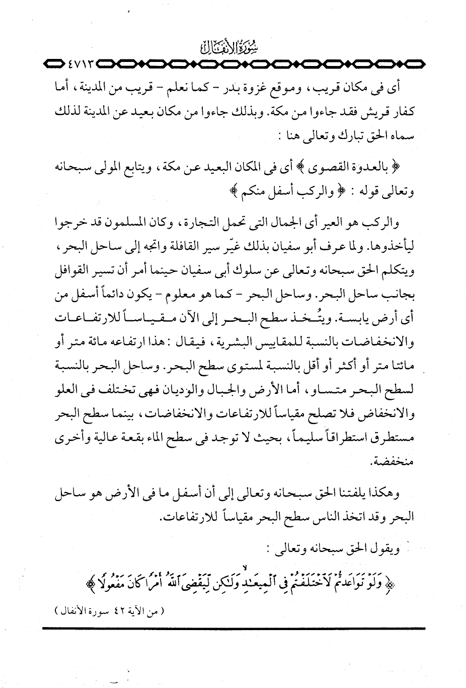 والركب هو العير أي الجمال التي تحمل التجارة، وكان المسلمون قد خرجوا ليأخذوها. ولما عرف أبو سفيان بذلك غيّر سير القافلة واتجه إلى ساحل البحر، ويتكلم الحق سبحانه وتعالى عن سلوك أبي سفيان حينما أمر أن تسير القوافل بجانب ساحل البحر. وساحل البحر - كما هو معلوم - يكون دائماً أسفل من أي أرض يابسة. ويُتخذ سطح البحر إلى الآن مقياساً للارتفاعات والانخفاضات بالنسبة للمقاييس البشرية، فيقال: هذا ارتفاعه مائة متر أو مائتا متر أو أكثر أو أقل بالنسبة لمستوى سطح البحر. وساحل البحر بالنسبة لسطح البحر متساو، أما الأرض والجبال والوديان فهي تختلف في العلو والانخفاض فلا تصلح مقياساً للارتفاعات والانخفاضات، بينما سطح البحر مستطرق استطراقاً سليماً، بحيث لا توجد في سطح الماء بقعة عالية وأخرى منخفضة.