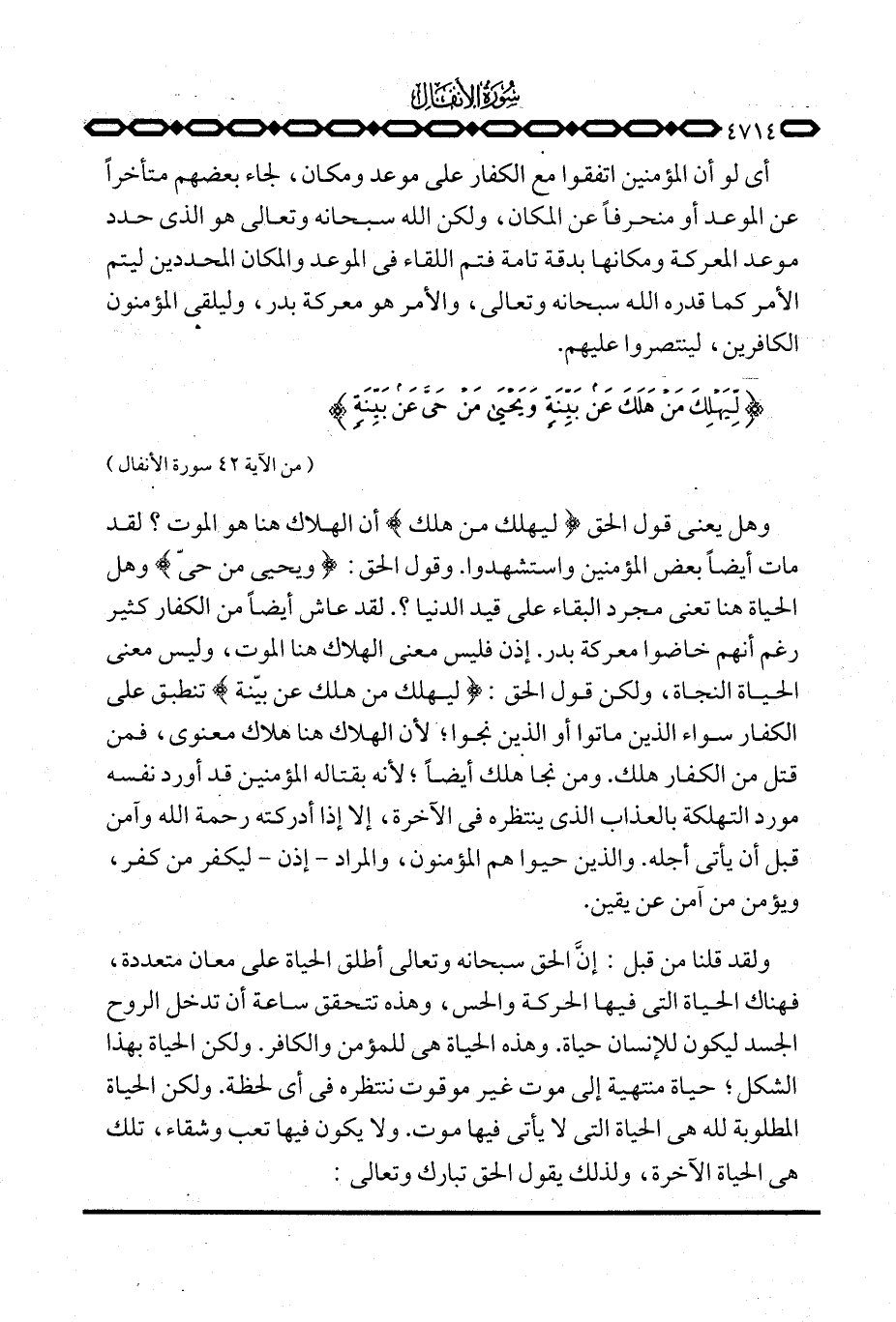 وقول الحق: {ويحيى مَنْ حَيَّ} وهل الحياة هنا تعني مجرد البقاء على قيد الدنيا؟ . لقد عاش أيضاً من الكفار كثير رغم أنهم خاضوا معركة بدر. إذن فليس معنى الهلاك هنا الموت، وليس معنى الحياة النجاة، ولكن قول الحق {لِّيَهْلِكَ مَنْ هَلَكَ عَن بَيِّنَةٍ} تنطبق على الكفار سواء الذين ماتوا أو الذين نجوا؛ لأن الهلاك هنا هلاك معنوي، فمن قتل من الكفارهلك. ومن نجا هلك أيضاً؛ لأنه بقتاله المؤمنين قد أورد نفسه مورد التهلكة بالعذاب الذي ينتظره في الآخرة، إلا إذا أدركته رحمة الله وآمن قبل أن يأتي أجله. والذين حيوا هم المؤمنون، والمراد - إذن - ليكفر من كفر، ويؤمن من آمن عن يقين.