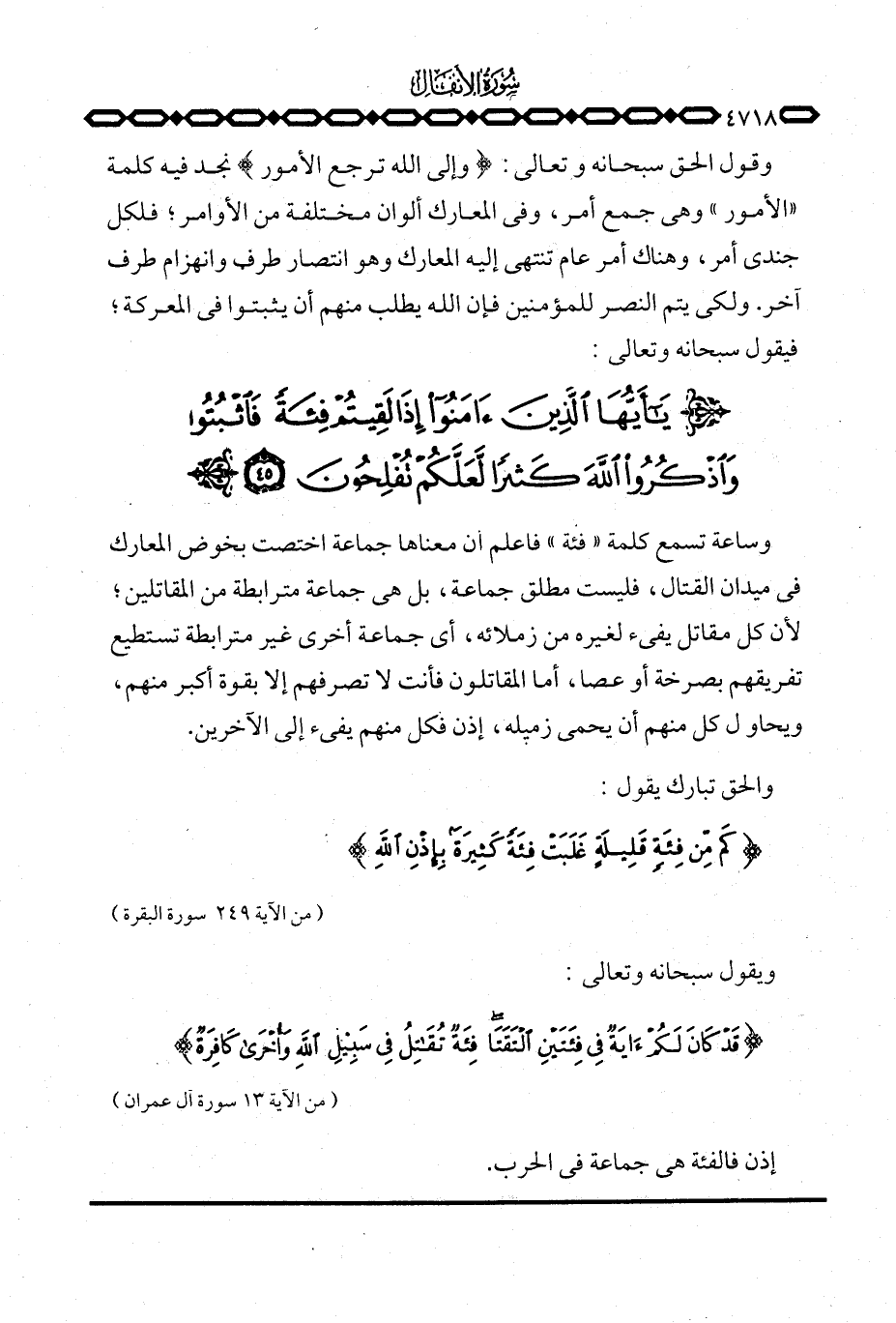 وقول الحق سبحانه وتعالى: {وَإِلَى الله تُرْجَعُ الأمور} نجد فيه كلمة «الأمور» وهي جمع أمر، وفي المعارك ألوان مختلفة من الأوامر؛ فلكل جندي أمر، وهناك أمر عام تنتهي إليه المعارك وهو انتصار طرف وانهزام طرف آخر. ولكي يتم النصر للمؤمنين فإن الله يطلب منهم أن يثبتوا في المعركة؛ فيقول سبحانه وتعالى: {ياأيها الذين آمنوا إِذَا لَقِيتُمْ فِئَةً فاثبتوا ... }