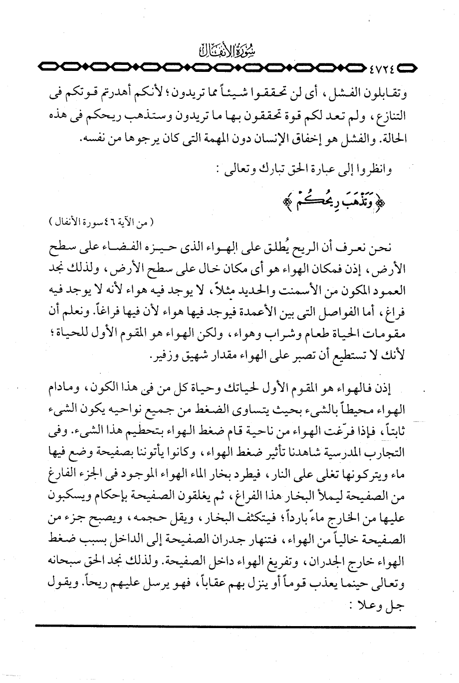 إذن فالهواء هو المقوم الأول لحياتك وحياة كل من في هذا الكون، وما دام الهواء محيطاً بالشيء بحيث يتساوى الضغط من جميع نواحيه يكون الشيء ثابتاً، فإذا فرّغت الهواء من ناحية قام ضغط الهواء بتحطيم هذا الشيء. وفي التجارب المدرسية شاهدنا تأثير ضغط الهواء، وكانوا يأتوننا بصفيحة وضع فيها ماء ويتركونها تغلي على النار، فيطرد بخار الماء الهواء الموجود في الجزء الفارغ من الصفيحة ليملأ البخار هذا الفراغ، ثم يغلقون الصفيحة بإحكام ويسكبون عليها من الخارج ماءً بارداً؛ فيتكثف البخار، ويقل حجمه، ويصبح جزء من الصفيحة خالياً من الهواء، فتنهار جدران الصفيحة إلى الداخل بسبب ضغط الهواء خارج الجدران، وتفريغ الهواء داخل الصفيحة. ولذلك نجد الحق سبحانه وتعالى حينما يعذب قوماً أو ينزل بهم عقاباً، فهو يرسل عليهم ريحاً. ويقول جل وعلا: