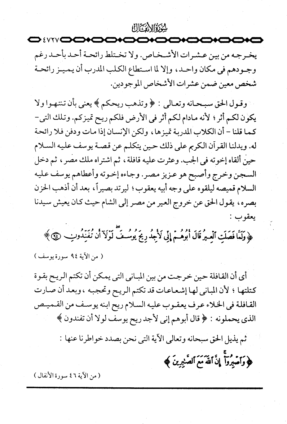 وقول الحق سبحانه وتعالى: {وَتَذْهَبَ رِيحُكُمْ} يعني بأن تنتهوا ولا يكون لكم أثر؛ لأنه ما دام لكم أثر في الأرض فلكم ريح تميزكم. وتلك التي - كما قلنا - أن الكلاب المدربة تميزها، ولكن الإنسان إذا مات ودفن فلا رائحة له. ويدلنا القرآن الكريم على ذلك حين يتكلم عن قصة يوسف عليه السلام حين ألقاه إخوته في الجب. وعثرت عليه قافلة، ثم اشتراه ملك مصر، ثم دخل السجن وخرج وأصبح هو عزيز مصر. وجاءه إخوته وأعطاهم يوسف عليه السلام قميصه ليلقوه على وجه أبيه يعقوب؛ ليرتد بصيراً، بعد أن أذهب الحزن بصره، يقول الحق عن خروج العير من مصر إلى الشام حيث كان يعيش سيدنا يعقوب:
