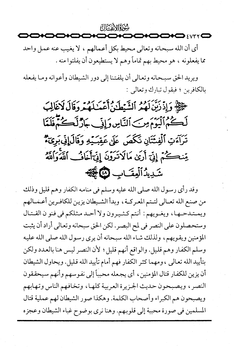 وقد رأى رسول الله صَلَّى اللَّهُ عَلَيْهِ وَسَلَّم َ في منامه الكفار وهم قليل وذلك من صنع الله تعالى لتتم المعركة، وبدأ الشيطان يزين للكافرين أعمالهم ويمتدحها، ويغويهم: أنتم كثيرون ولا أحد مثلكم في فنون القتال وستحصلون على النصر في لمح البصر. لكن الحق سبحانه وتعالى أراد أن يثبت المؤمنين ويقويهم، ولذلك شاء الله سبحانه أن يرى رسول الله صَلَّى اللَّهُ عَلَيْهِ وَسَلَّم َ الكفار وهم قليل. والواقع أنهم قليل؛ لأن النصر ليس هنا بالعدد ولكن بتأييد الله تعالى، ومهما كثر الكفار فهم أمام تأييد الله قليل. ويحاول الشيطان أن يزين للكفار قتال المؤمنين، أي يجعله محبباً إلى نفوسهم وأنهم سيحققون النصر، ويصبحون حديث الجزيرة العربية كلها، وتخافهم الناس وتهابهم ويصبحون هم الكبراء وأصحاب الكلمة. وهكذا صور الشيطان لهم عملية قتال المسلمين في صورة محببة إلى قلوبهم. وهنا نرى بوضوح غباء الشيطان وعجزه