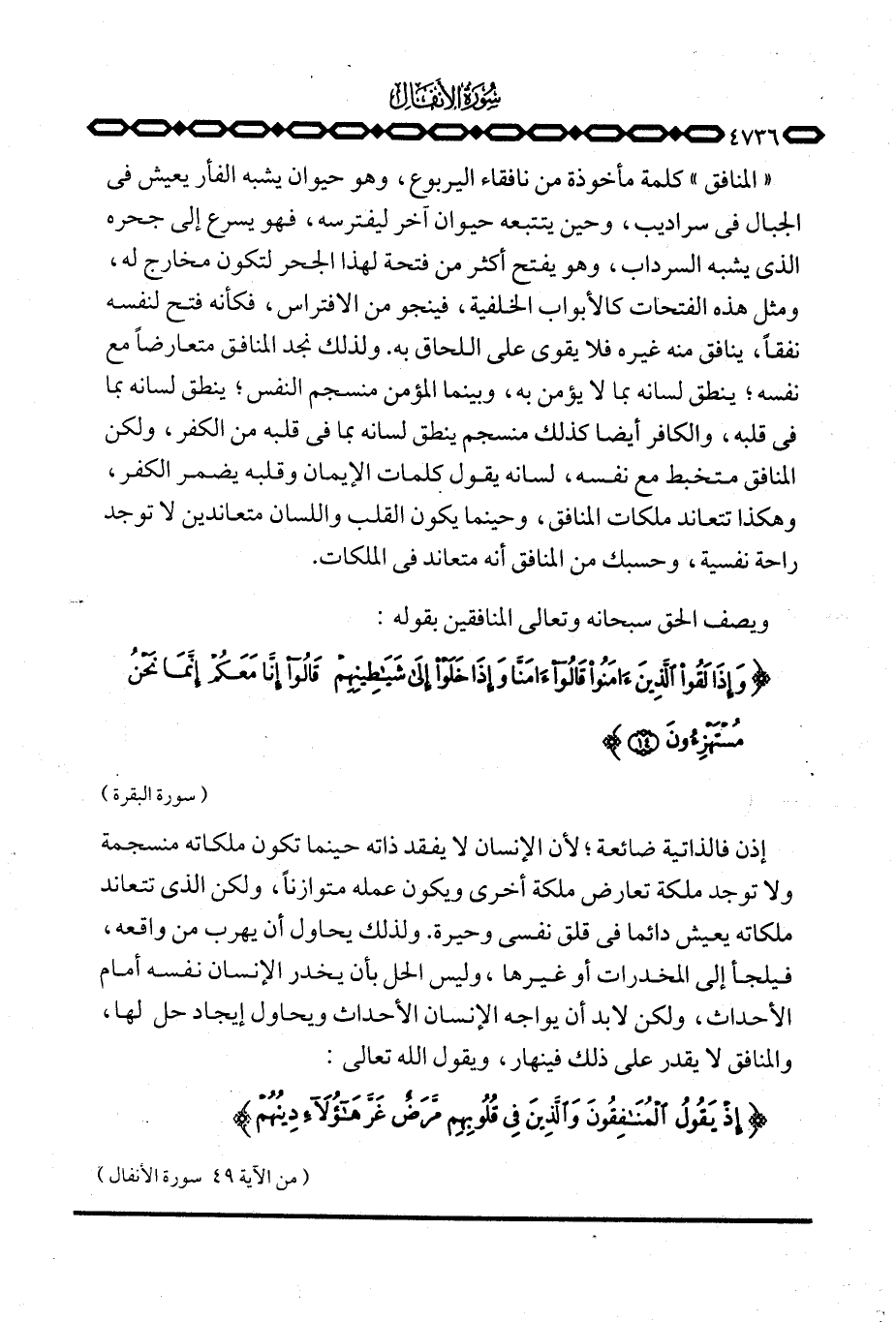 «المنافق» كلمة مأخوذة من نافقاء اليربوع، وهو حيوان يشبه الفأر يعيش في الجبال في سراديب، وحين يتتبعه حيوان آخر ليفترسه، فهو يسرع إلى جحره الذي يشبه السرداب، وهو يفتح أكثر من فتحة لهذا الجحر لتكون مخارج له، ومثل هذه الفتحات كالأبواب الخلفية، فينجو من الافتراس، فكأنه فتح لنفسه نفقاً، ينافق منه غيره فلا يقوى على اللحاق به. ولذلك نجد المنافق متعارضاً مع نفسه؛ ينطق لسانه بما لا يؤمن به، وبينما المؤمن منسجم النفس؛ ينطق لسانه بما في قلبه، والكافر أيضا كذلك منسجم ينطق لسانه بما في قلبه من الكفر، ولكن المنافق متخبط مع نفسه، لسانه يقول كلمات الإيمان وقلبه يضمر الكفر، وهكذا تتعاند ملكات المنافق، وحينما يكون القلب واللسان متعاندين لا توجد راحة نفسية، وحسبك من المنافق أنه متعاند في الملكات.