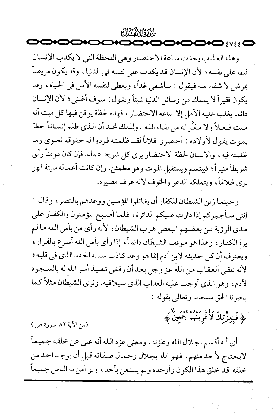 أي أنه أقسم بجلال الله وعزته. ومعنى عزة الله أنه غني عن خلقه جميعاً لا يحتاج لأحد منهم، فهو الله بجلال وجمال صفاته قبل أن يوجد أحد من خلقه قد خلق هذا الكون وأوجده ولم يستعن بأحد، ولو آمن به الناس جميعاً