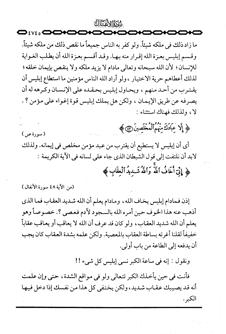 أي أن إبليس لا يستطيع أن يقترب من عبد مؤمن مخلص في إيمانه. ولذلك لا بد أن نلتفت إلى قول الشيطان الذي جاء على لسانه في الآية الكريمة: {إني أَخَافُ الله والله شَدِيدُ العقاب} [الأنفال: 48] .