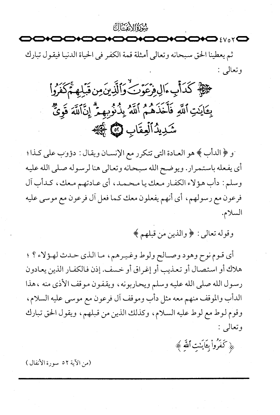 و {الدأب} هو العادة التي تتكرر مع الإنسان ويقال: دؤوب على كذا؛ أي يفعله باستمرار. ويوضح الله سبحانه وتعالى هنا لرسوله صَلَّى اللَّهُ عَلَيْهِ وَسَلَّم َ: دأب هؤلاء الكفار معك يا محمد، أي عادتهم معك، كدأب آل فرعون مع رسولهم، أي أنهم يفعلون معك يا محمد، أي عادتهم معك، كدأب آل فرعون مع رسولهم، أي أنهم يفعلون معك كما فعل آل فرعون مع موسى عليه السلام.