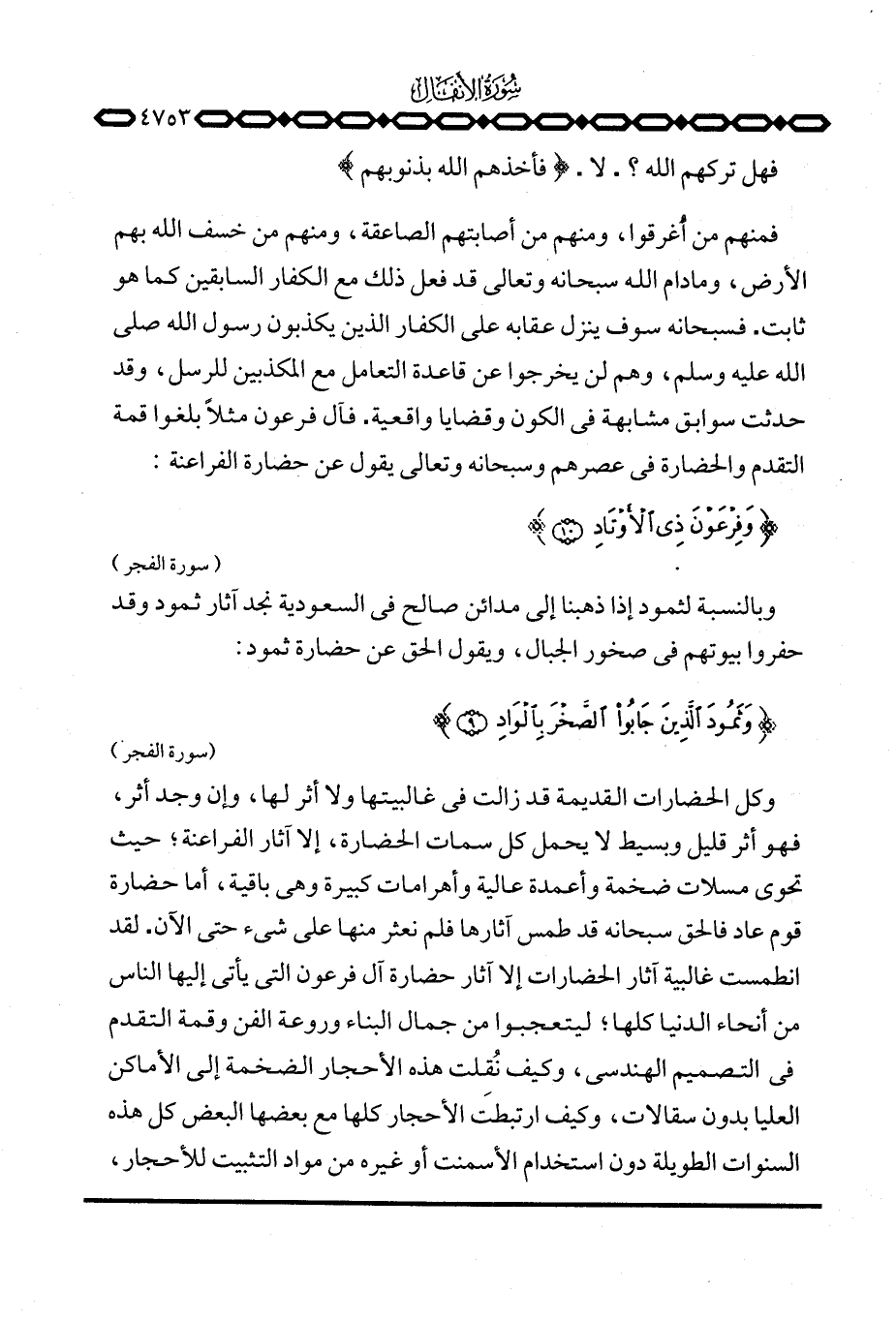 وكل الحضارات القديمة قد زالت في غالبيتها ولا أثر لها، وإن وجد أثر، فهو أثر قليل وبسيط لا يحمل كل سمات الحضارة، إلا آثار الفراعنة؛ حيث تحوي مسلات ضخمة وأعمدة عالية وأهرامات كبيرة وهي باقية، أما حضارة قوم عاد فالحق سبحانه قد طمس آثارها فلم نعثر منها على شيء حتى الآن. لقد انطمست غالبية آثار الحضارات إلا آثار حضارة آل فرعون التي يأتي إليها الناس من أنحاء الدنيا كلها؛ ليتعجبوا من جمال البناء وروعة الفن وقمة التقدم في التصميم الهندسي، وكيف نُقِلت هذه الأحجار الضخمة إلى الأماكن العليا بدون سقالات، وكيف ارتبطت الأحجار كلها مع بعضها البعض كل هذه السنوات الطويلة دون استخدام الأسمنت أو غيره من مواد التثبيت للأحجار،