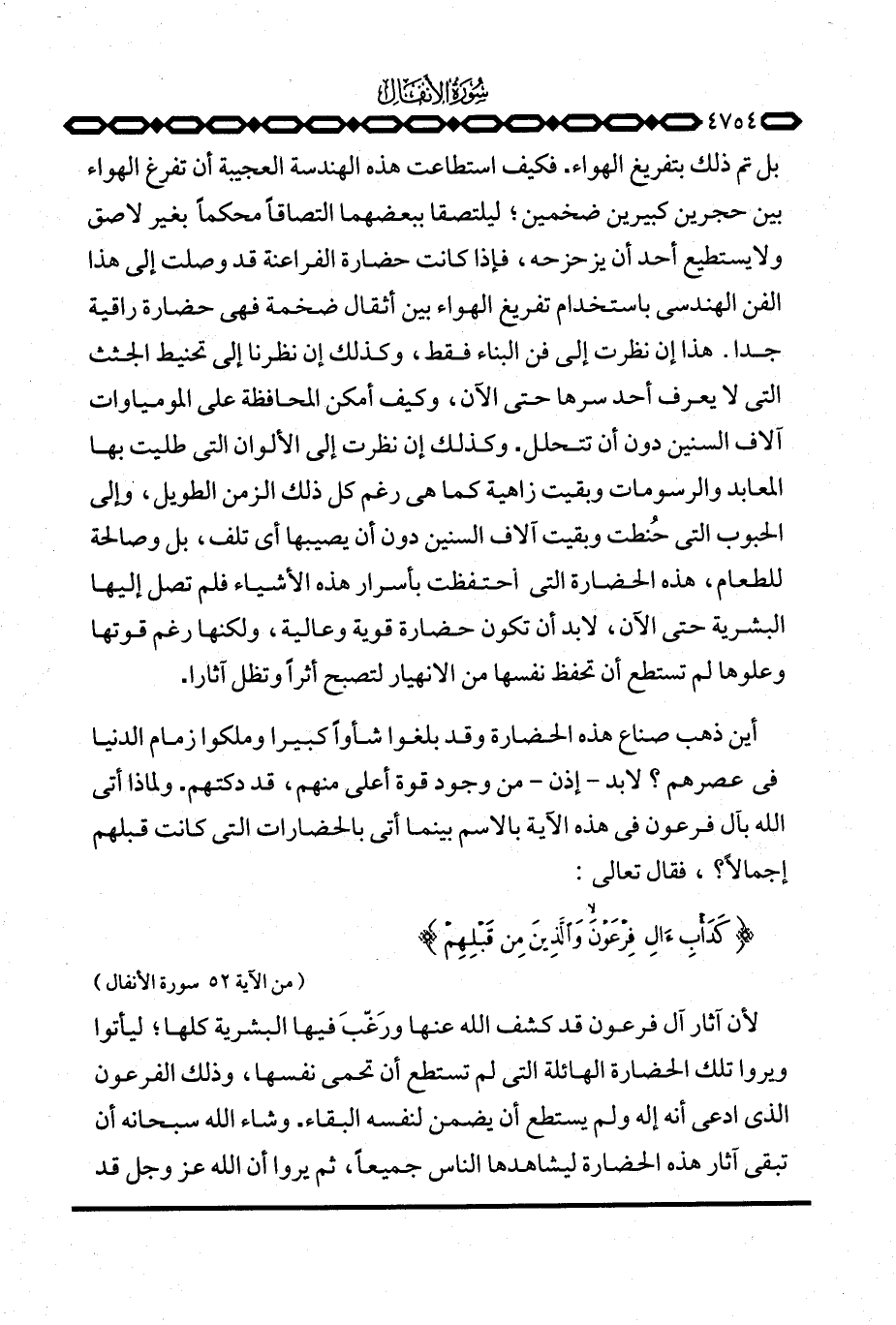 هذا إن نظرت إلى فن البناء فقط، وكذلك إن نظرنا إلى تحنيط الجثث التي لا يعرف أحد سرها حتى الآن، وكيف أمكن المحافظة على المومياوات آلاف السنين دون أن تتحلل. وكذلك إن نظرت إلى الألوان التي طليت بها المعابد والرسومات وبقيت زاهية كما هي رغم كل ذلك الزمن الطويل، وإلى الحبوب التي حُنطت وبقيت آلاف السنين دون أن يصيبها أي تلف، بل وصالحة للطعام، هذه الحضارة التي احتفظت بأسرار هذه الأشياء فلم تصل إليها البشرية حتى الآن، لا بد أن تكون حضارة قوية وعالية، ولكنها رغم قوتها وعلوها لم تستطع أن تحفظ نفسها من الانهيار لتصبح أثراً وتظل آثارا.