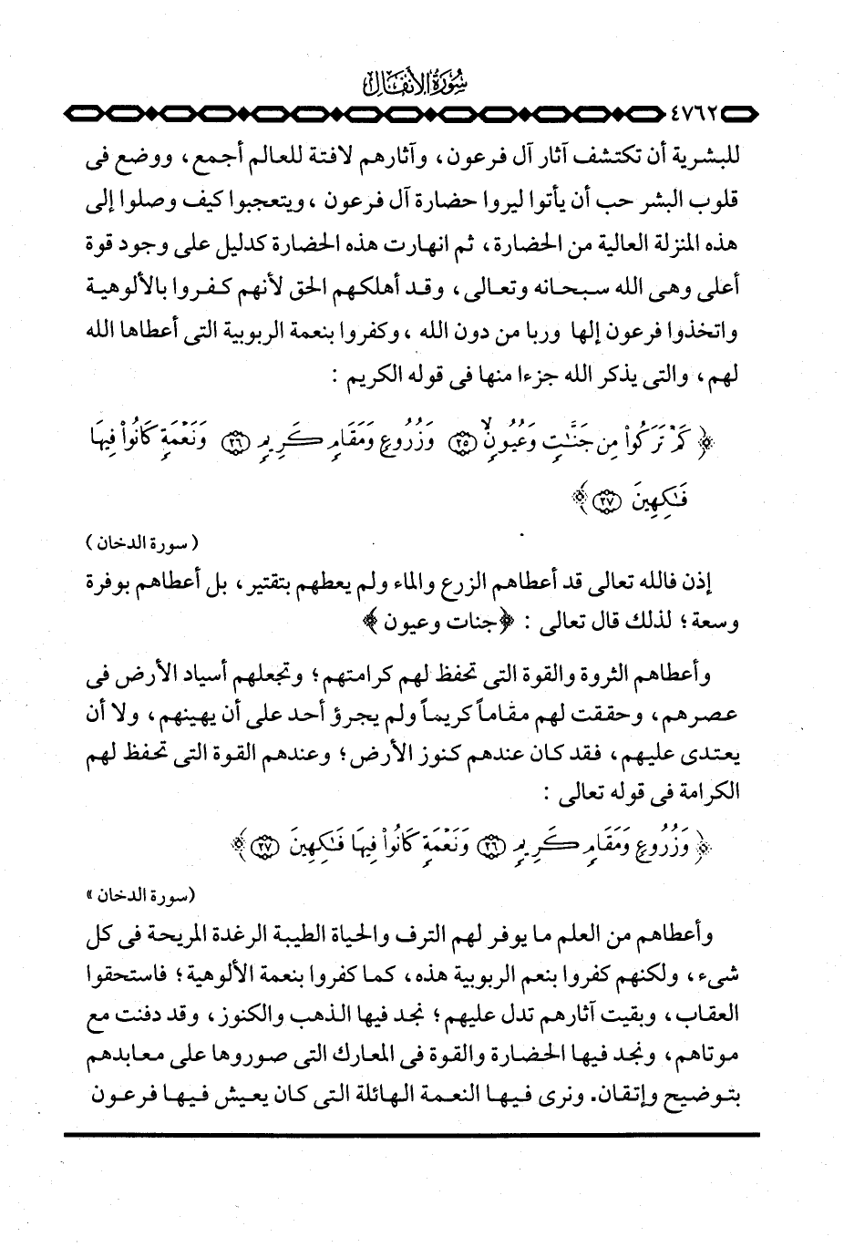وأعطاهم من العلم ما يوفر لهم الترف والحياة الطيبة الرغدة المريحة في كل شيء، ولكنهم كفروا بنعم الربوبية هذه، كما كفروا بنعمة الألوهية؛ فاستحقوا العقاب، وبقيت آثارهم تدل عليهم؛ نجد فيها الذهب والكنوز، وقد دفنت مع موتاهم، ونجد فيها الحضارة والقوة في المعارك التي صوروها على معابدهم بتوضيح وإتقان. ونرى فيها النعمة الهائلة التي كان يعيش فيها فرعون