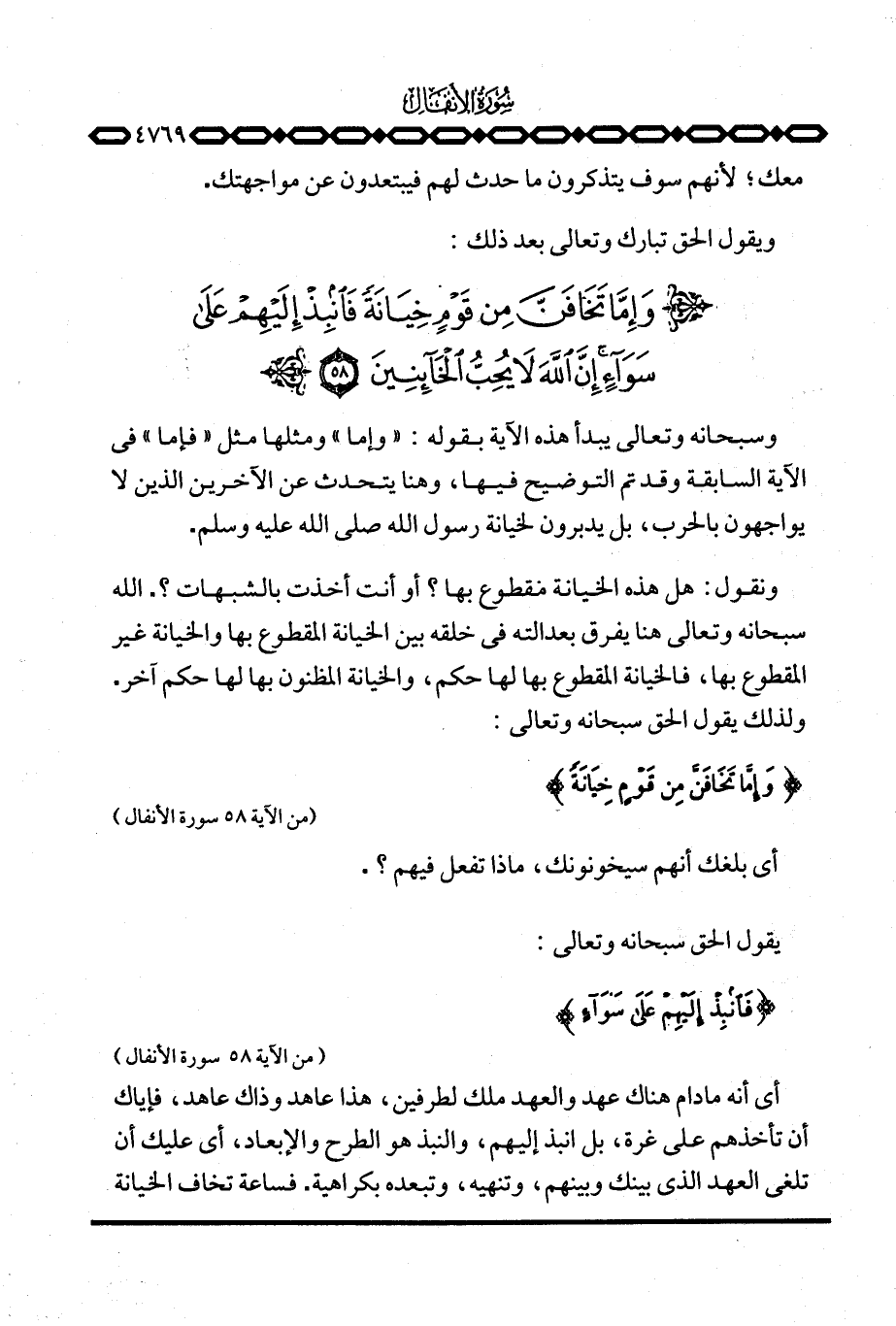 ويقول الحق تبارك وتعالى بعد ذلك: {وَإِمَّا تَخَافَنَّ مِن قَوْمٍ خِيَانَةً فانبذ إِلَيْهِمْ على سَوَآءٍ ... }