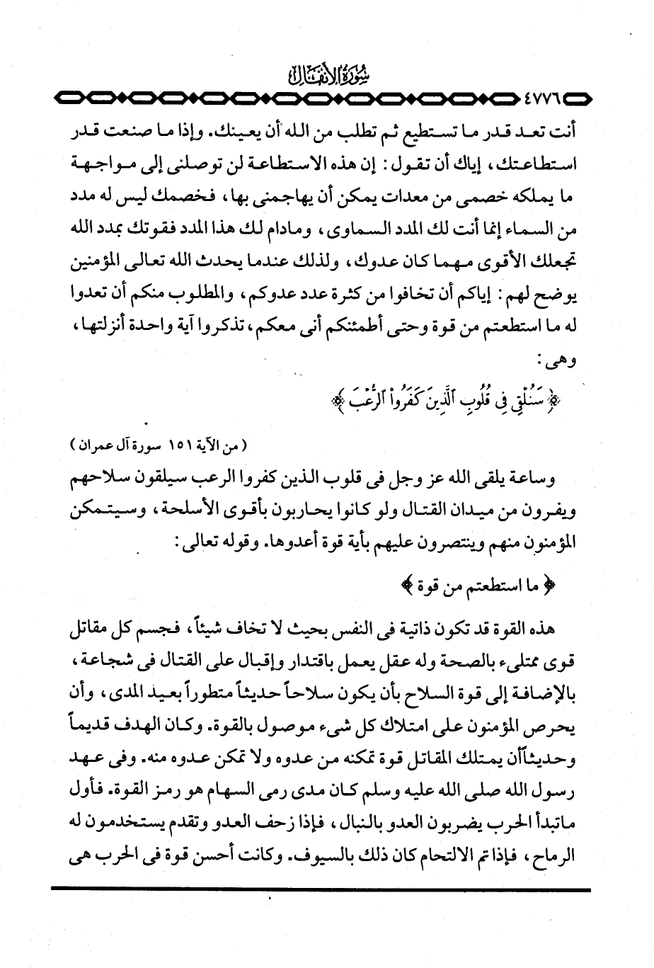 هذه القوة قد تكون ذاتية في النفس بحيث لا تخاف شيئاً، فجسم كل مقاتل قوي ممتليء بالصحة وله عقل يعمل باقتدار وإقبال على القتال في شجاعة، بالإضافة إلى قوة السلاح بأن يكون سلاحاً حديثاً متطوراً بعيد المدى، وأن يحرص المؤمنون على امتلاك كل شيء موصول بالقوة. وكان الهدف قديماً وحديثاً أن يمتلك المقاتل قوة تمكنه من عدوه ولا تمكن عدوه منه. وفي عهد رسول الله صَلَّى اللَّهُ عَلَيْهِ وَسَلَّم َ كان مدى رمي السهام هو رمز القوة. فأول ما تبدأ الحرب يضربون العدو بالنبال، فإذا زحف العدو وتقدم يستخدمون له الرماح، فإذا تم الالتحام كان ذلك بالسيوف. وكانت أحسن قوة في الحرب هي