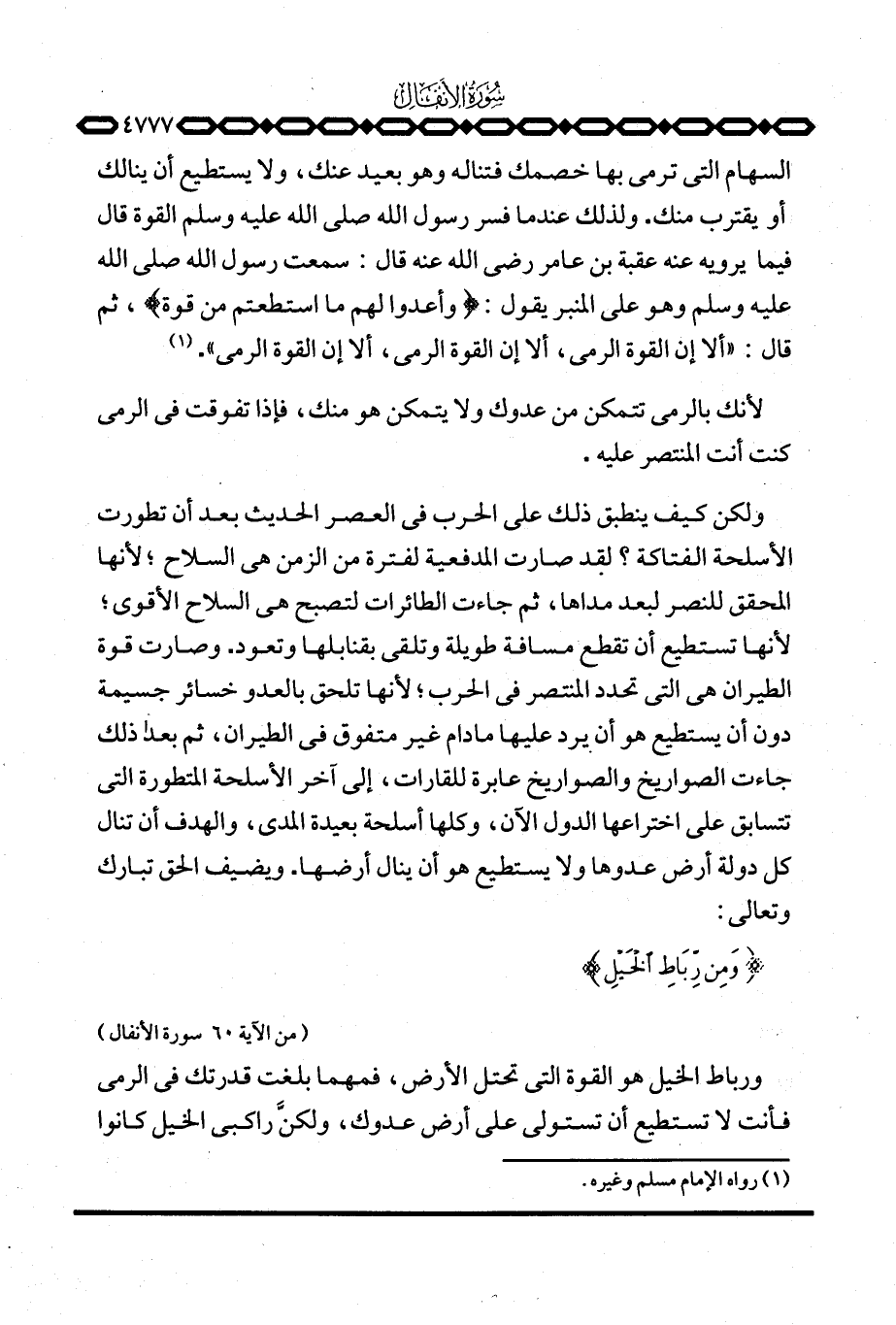 ولكن كيف ينطبق ذلك على الحرب في العصر الحديث بعد أن تطورت الأسلحة الفتاكة؟ لقد صارت المدفعية لفترة من الزمن هي السلاح؛ لأنها المحقق للنصر لبعد مداها، ثم جاءت الطائرات لتصبح هي السلاح الأقوى؛ لأنها تستطيع أن تقطع مسافة طويلة وتلقي بقنابلها وتعود. وصارت قوة الطيران هي التي تحدد المنتصر في الحرب؛ لأنها تلحق بالعدو خسائر جسيمة دون أن يستطيع هو أن يرد عليها ما دام غير متفوق في الطيران، ثم بعد ذلك جاءت الصواريخ والصواريخ عابرة للقارات، إلى آخر الأسلحة المتطورة التي تتسابق على اختراعها الدول الآن، وكلها أسلحة بعيدة المدى، والهدف أن تنال كل دولة أرض عدوها ولا يستطيع هو أن ينال أرضها. ويضيف الحق تبارك وتعالى: