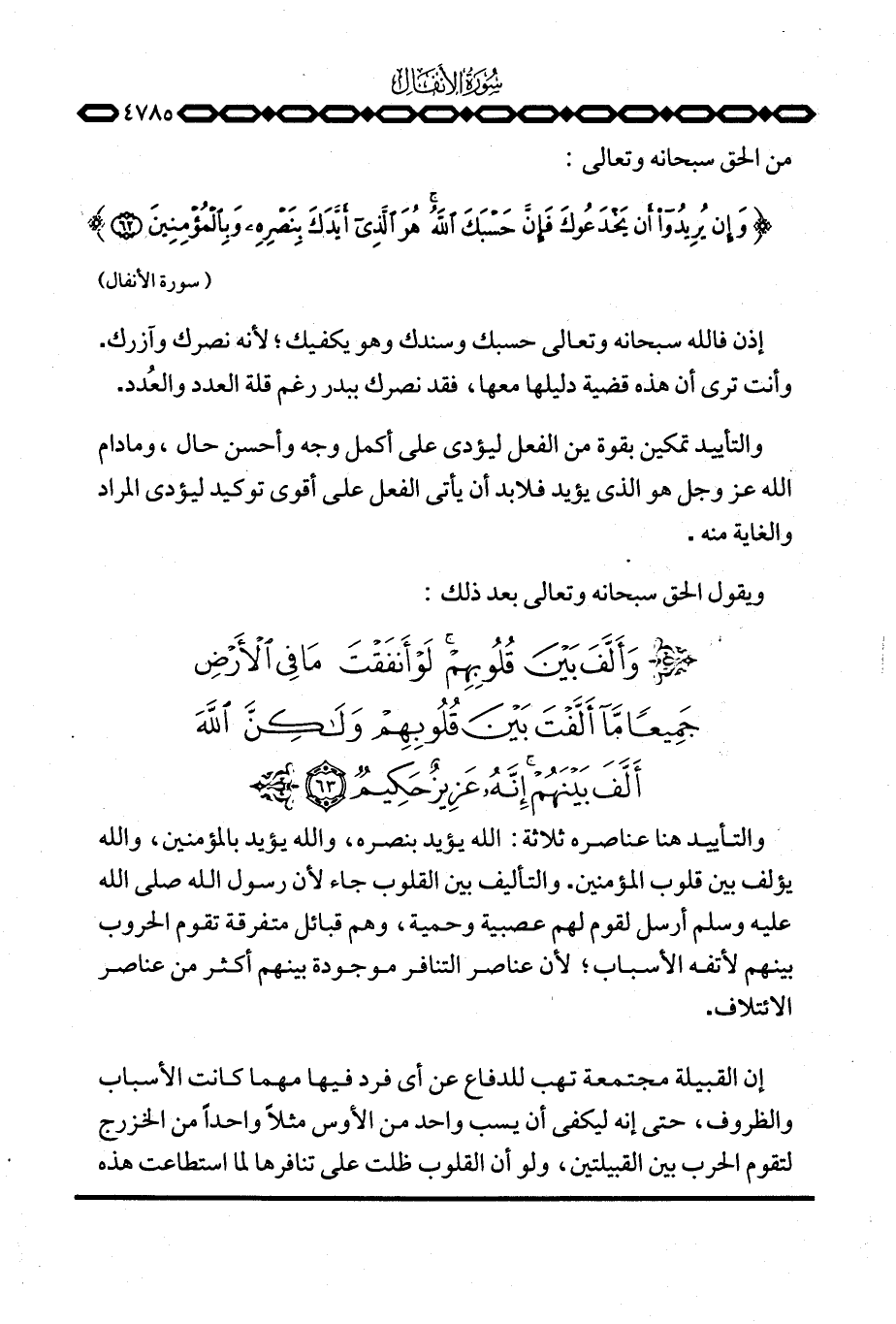والتأييد هنا عناصره ثلاثة: الله يؤيد بنصره، والله يؤيد بالمؤمنين، والله يؤلف بين قلوب المؤمنين. والتأليف بين القلوب جاء لأن رسول الله صَلَّى اللَّهُ عَلَيْهِ وَسَلَّم َ أرسل لقوم لهم عصبية وحمية، وهم قبائل متفرقة تقوم الحروب بينهم لأتفه الأسباب؛ لأن عناصر التنافر موجودة بينهم أكثر من عناصر الائتلاف.