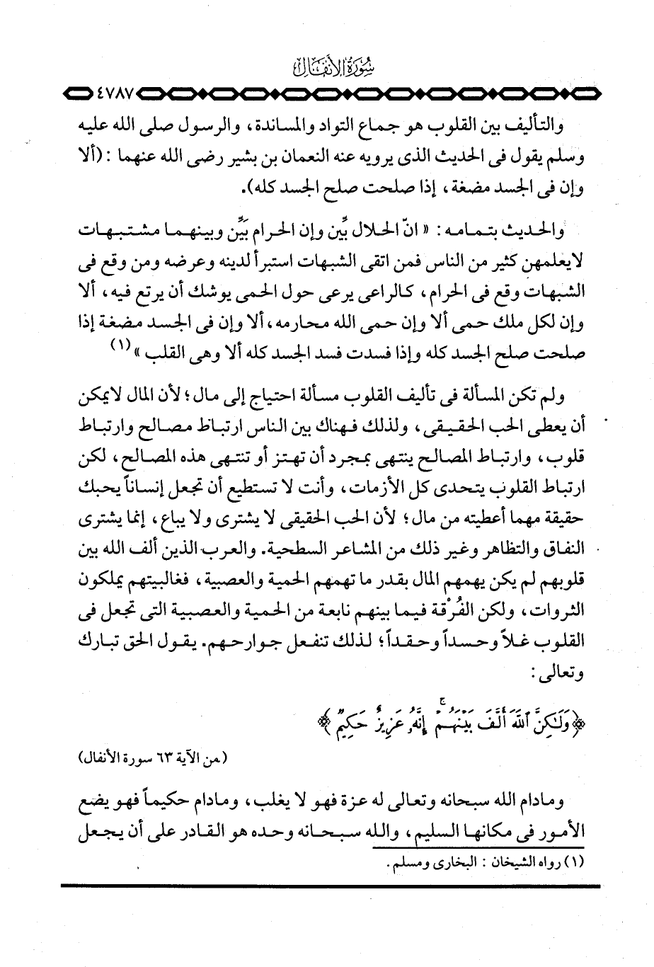 والتأليف بين القلوب هو جماع التواد والمساندة، والرسول صَلَّى اللَّهُ عَلَيْهِ وَسَلَّم َ يقول في الحديث الذي يرويه عنه النعمان بن بشير رَضِيَ اللَّهُ عَنْهما: «ألا وإن في الجسد مضغة، إذا صلحت صلح الجسد كله» .