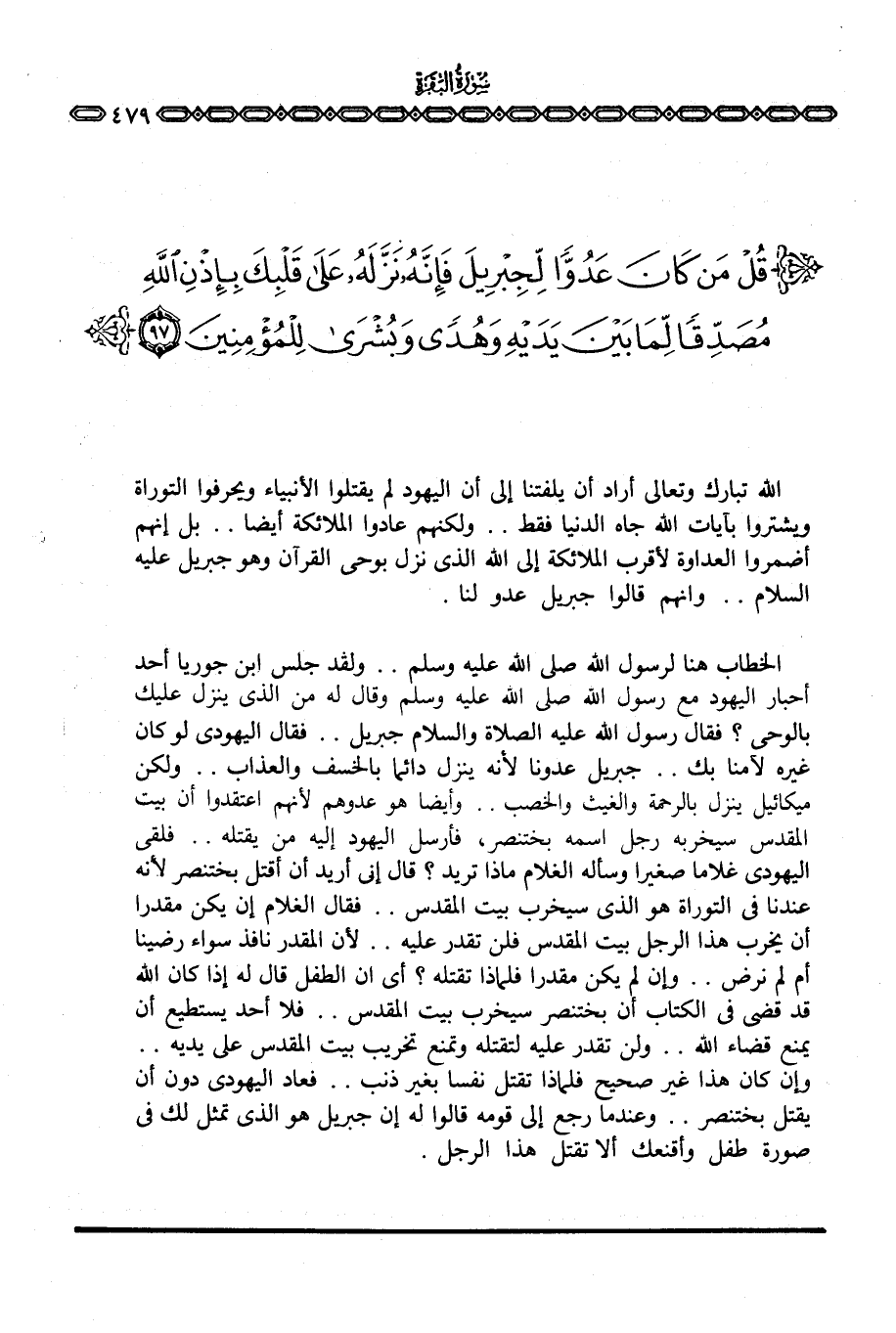 الخطاب هنا لرسول الله صَلَّى اللَّهُ عَلَيْهِ وَسَلَّم َ. . ولقد جلس ابن جوريا أحد أحبار اليهود مع رسول الله صَلَّى اللَّهُ عَلَيْهِ وَسَلَّم َ وقال له من الذي ينزل عليك بالوحي؟ فقال رسول الله صَلَّى اللَّهُ عَلَيْهِ وَسَلَّم َ جبريل. . فقال اليهودي لو كان غيره لآمنا بك. . جبريل عدونا لأنه ينزل دائما بالخسف والعذاب. . ولكن ميكائيل ينزل بالرحمة والغيث والخصب. . وأيضا هو عدوهم لأنهم اعتقدوا أن بيت المقدس سيخربه رجل اسمه بختنصر، فأرسل اليهود إليه من يقتله. . فلقى اليهودي غلاما صغيرا وسأله الغلام ماذا تريد؟ قال إني أريد أن أقتل بختنصر لأنه عندنا في التوراة هو الذي سيخرب بيت المقدس. . فقال الغلام إن يكن مقدرا أن يخرب هذا الرجل بيت المقدس فلن تقدر عليه. . لأن المقدر نافذ سواء رضينا أم لم نرضى. . وإن لم يكن مقدرا فلماذا تقتله؟ أي أن الطفل قال له إذا كان الله قد قضى في الكتاب أن بختنصر سيخرب بيت المقدس. . فلا أحد يستطيع أن يمنع قضاء الله. . ولن تقدر عليه لتقتله وتمنع تخريب بيت المقدس على يديه. . وإن كان هذا غير صحيح فلماذا تقتل نفسا بغير ذنب. . فعاد اليهودي دون أن يقتل بختنصر. . وعندما رجع إلى قومه قالوا له إن جبريل هو الذي تمثل لك في صورة طفل وأقنعك ألا تقتل هذا الرجل.