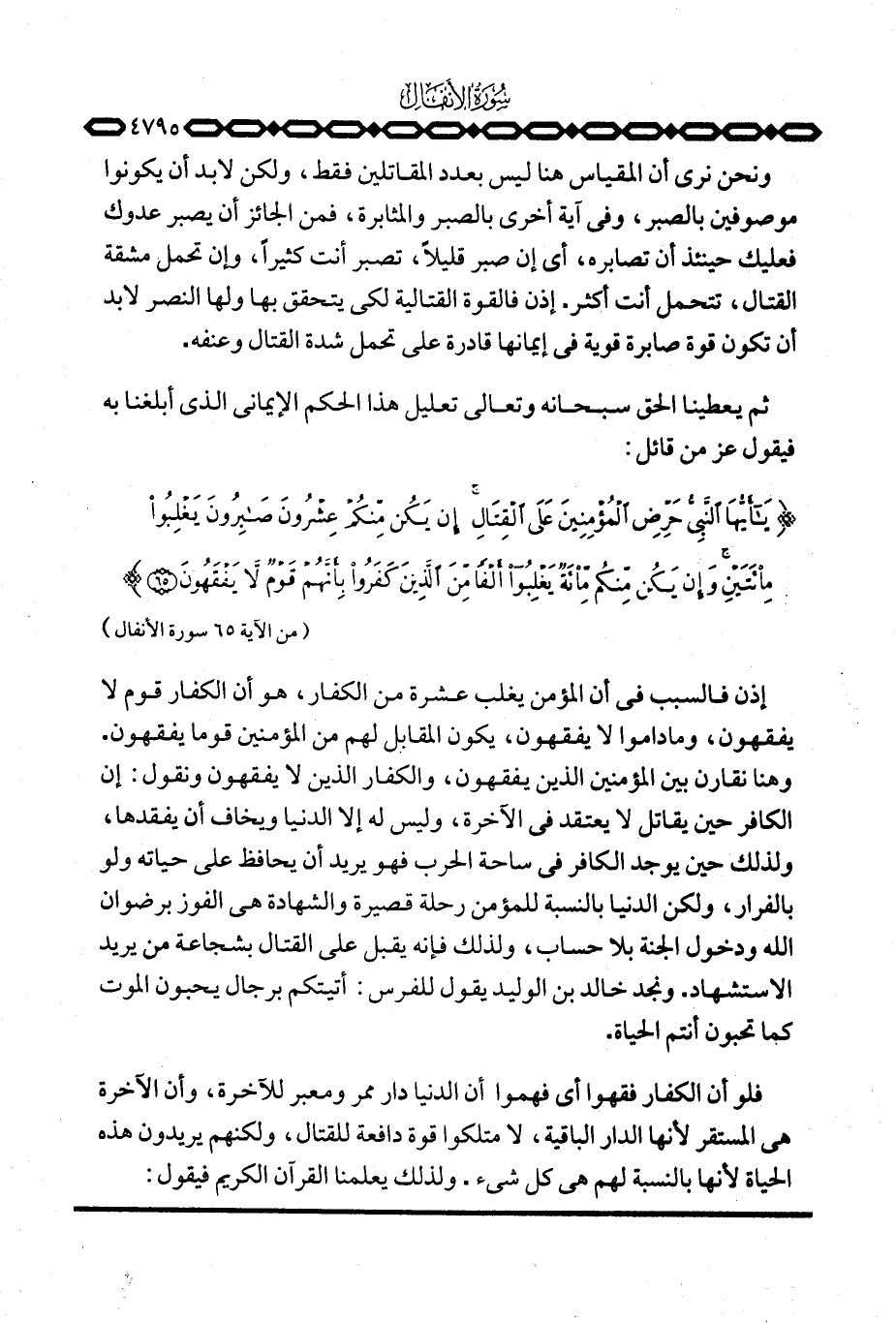 {ياأيها النبي حَرِّضِ المؤمنين عَلَى القتال إِن يَكُن مِّنكُمْ عِشْرُونَ صَابِرُونَ يَغْلِبُواْ مِئَتَيْنِ وَإِن يَكُنْ مِّنكُمْ مِّئَةٌ يغلبوا أَلْفاً مِّنَ الذين كَفَرُواْ بِأَنَّهُمْ قَوْمٌ لاَّ يَفْقَهُونَ} [الأنفال: 65] .