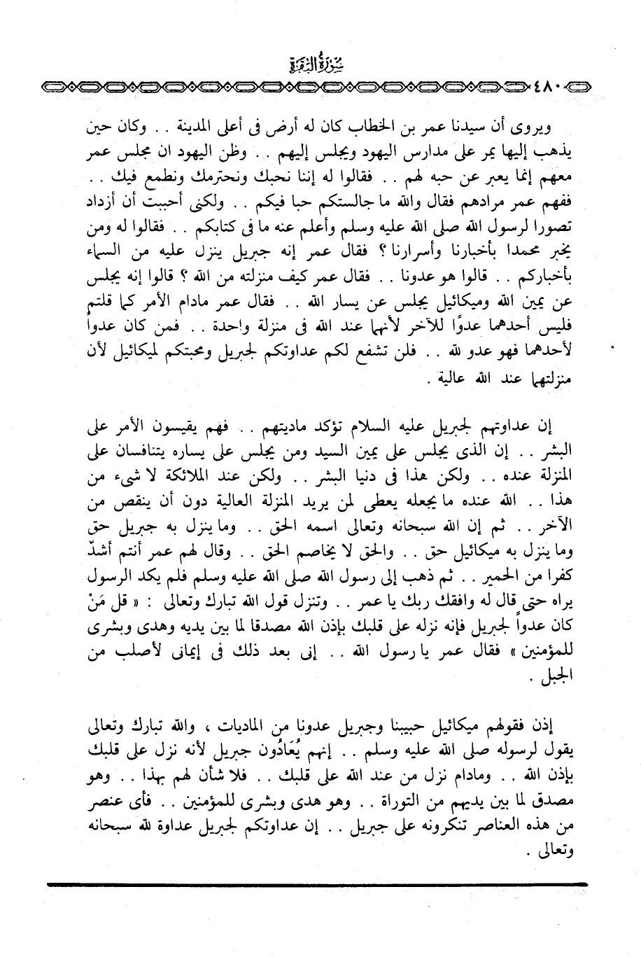 ويروى أن سيدنا عمر بن الخطاب كان له أرض في أعلى المدينة. . وكان حين يذهب إليها يمر على مدارس اليهود ويجلس إليهم. . وظن اليهود أن مجلس عمر معهم إنما يعبر عن حبه لهم. . فقالوا له إننا نحبك ونحترمك ونطمع فيك. . ففهم عمر مرادهم فقال والله ما جالستكم حبا فيكم. . ولكني أحببت أن أزداد تصورا لرسول الله صَلَّى اللَّهُ عَلَيْهِ وَسَلَّم َ وأعلم عنه ما في كتابكم. . فقالوا له ومن يخبر محمدا بأخبارنا وأسرارنا؟ فقال عمر إنه جبريل ينزل عليه من السماء بأخباركم. . قالوا هو عدونا. . فقال عمر كيف منزلته من الله؟ قالوا إنه يجلس عن يمين الله وميكائيل يجلس على يسار الله. . فقال عمر مادام الأمر كما قلتم فليس أحدهما عدواً للآخر لأنهما عند الله في منزلة واحدة.
