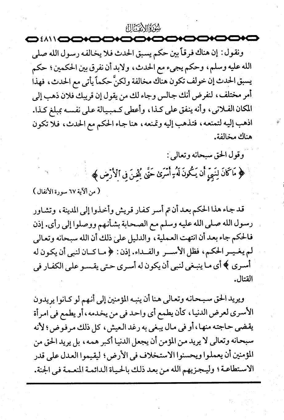 قد جاء هذا الحكم بعد أن تم أسر كفار قريش وأخذوا إل المدينة، وتشاور رسول الله صَلَّى اللَّهُ عَلَيْهِ وَسَلَّم َ مع الصحابة بشأنهم ووصلوا إلى رأي. إذن فالحكم جاء بعد أن انتهت العملية، والدليل على ذلك أن الله سبحانه وتعالى لم يغير الحكم، فظل الأسر والفداء. إذن: {مَا كَانَ لِنَبِيٍّ أَن يَكُونَ لَهُ أسرى} أي ما ينبغي لنبي أن يكون له أسرى حتى يقسو على الكفار في القتال.