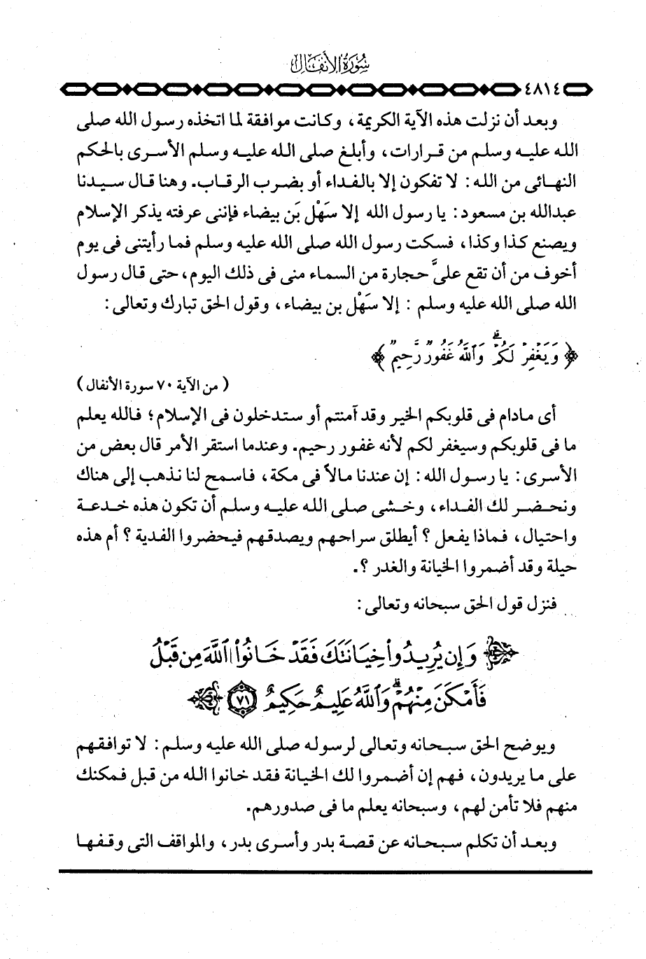 أي ما دام في قلوبكم الخير وقد آمنتم أو ستدخلون في الإسلام؛ فالله يعلم ما في وسيغفر لكم لأنه غفور رحيم. وعندما استقر الأمر قال بعض من الأسرى: يا رسول الله: إن عندنا مالاً في مكة، اسمح لنا نذهب إلى هناك ونحضر لك الفداء، وخشي صَلَّى اللَّهُ عَلَيْهِ وَسَلَّم َ أن تكون هذه خدعة واحتيال، فماذا يفعل؟ أيطلق سراحهم ويصدقهم فيحضروا الفدية؟ أم هذه حيلة وقد أضمروا الخيانة والغدر؟ .
