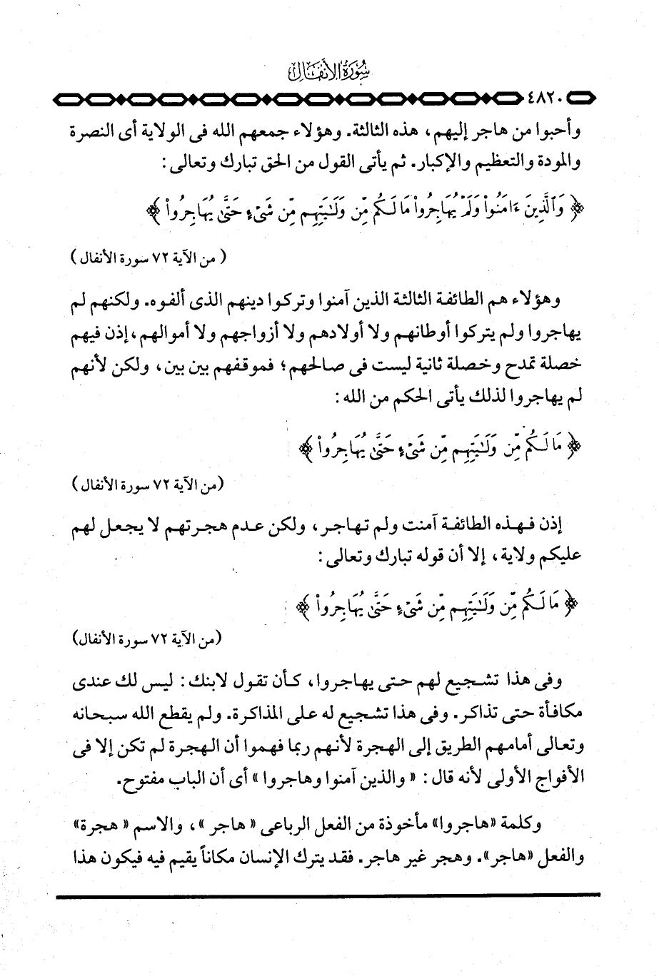 وفي هذا تشجيع لهم حتى يهاجروا، كأن تقول لابنك: ليس لك عندي مكافأة حتى تذاكر. وفي هذا تشجيع له على المذاكرة. ولم يقطع الله سبحانه وتعالى أمامهم الطريق إلى الهجرة لأنهم ربما فهموا أن الهجرة لم تكن إلا في الأفواج الأولى لأنه قال: و {الذين آمَنُواْ وَهَاجَرُواْ} أي أن الباب مفتوح.