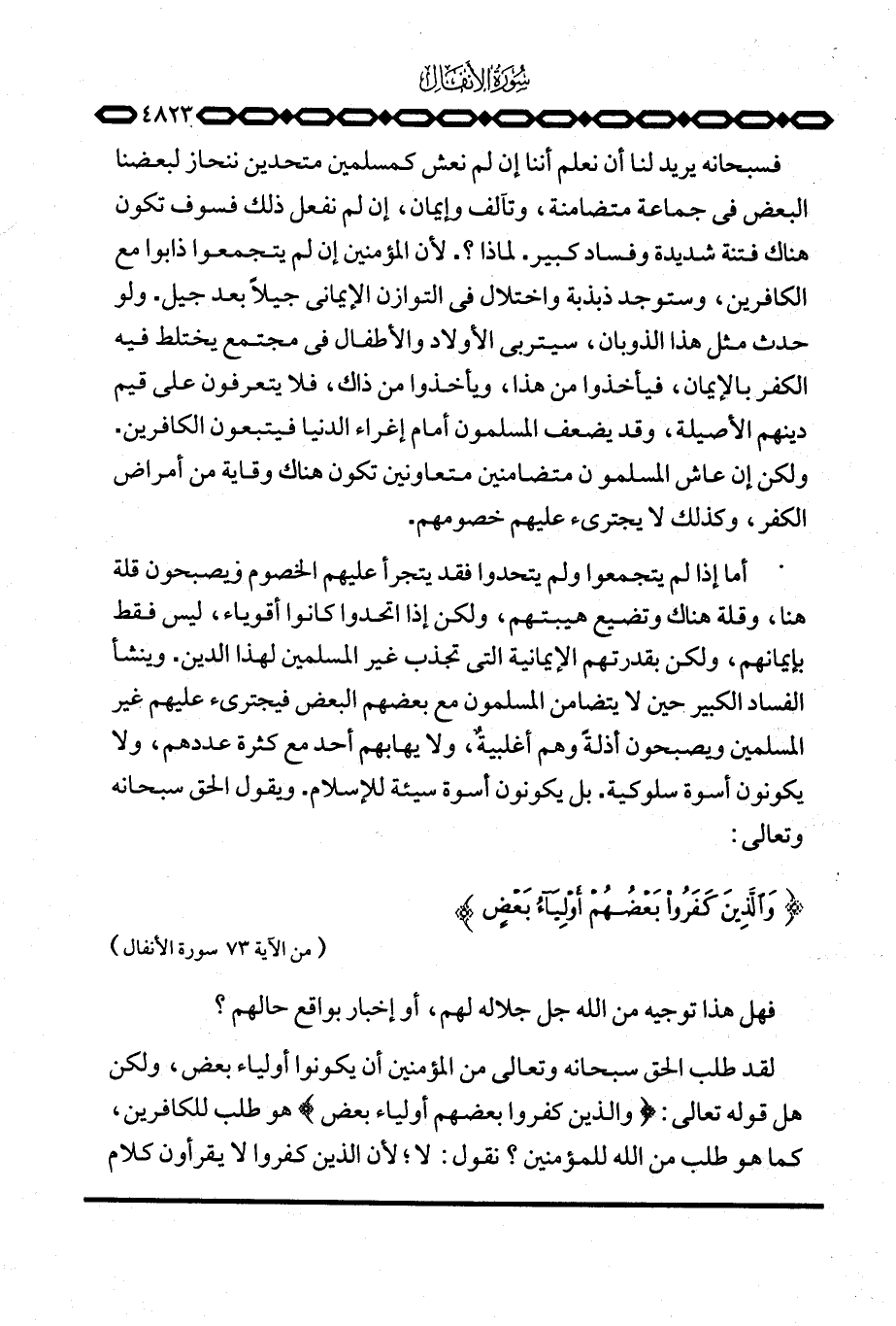 فسبحانه يريد لنا أن نعلم أننا إن لم نعش كمسلمين متحدين ننحاز لبعضنا البعض في جماعة متضامنة، وتآلف وإيمان، إن لم نفعل ذلك فسوف تكون هناك فتنة شديدة وفساد كبير. لماذا؟ . لأن المؤمنين إن لم يتجمعوا ذابوا مع الكافرين، وستوجد ذبذبة واختلال في التوازن الإيماني جيلاً بعد جيل. ولو حدث مثل هذا الذوبان، سيتربى الأولاد والأطفال في مجتمع يختلط فيه الكفر بالإيمان، فيأخذوا من هذا، ويأخذوا من ذاك، فلا يتعرفون على قيم دينهم الأصيلة، وقد يضعف المسلمون أمام إغراء الدنيا فيتبعون الكافرين. ولكن إن عاش المسلمون متضامنين متعاونين تكون هناك وقاية من أمراض الكفر، وكذلك لا يجتريءعليهم خصومهم.