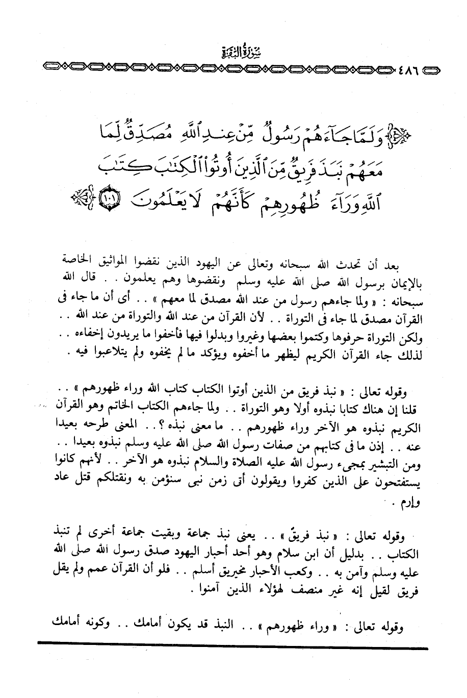 وقوله تعالى: {نَبَذَ فَرِيقٌ مِّنَ الذين أُوتُواْ الكتاب كِتَابَ الله وَرَآءَ ظُهُورِهِمْ} . . قلنا إن هناك كتابا نبذوه أولا وهو التوراة. . ولما جاءهم الكتاب الخاتم وهو القرآن الكريم نبذوه هو الآخر وراء ظهورهم. . ما معنى نبذه؟ . . المعنى طرحه بعيدا عنه. . إذن ما في كتابهم من صفات رسول الله صَلَّى اللَّهُ عَلَيْهِ وَسَلَّم َ نبذوه بعيدا. . ومن التبشير بمجيء رسول الله عَلَيْهِ الصَّلَاة وَالسَّلَام ُ نبذوه هو الآخر. . لأنهم كانوا يستفتحون على الذين كفروا ويقولون أتى زمن نبي سنؤمن به ونقتلكم قتل عاد وإرم.