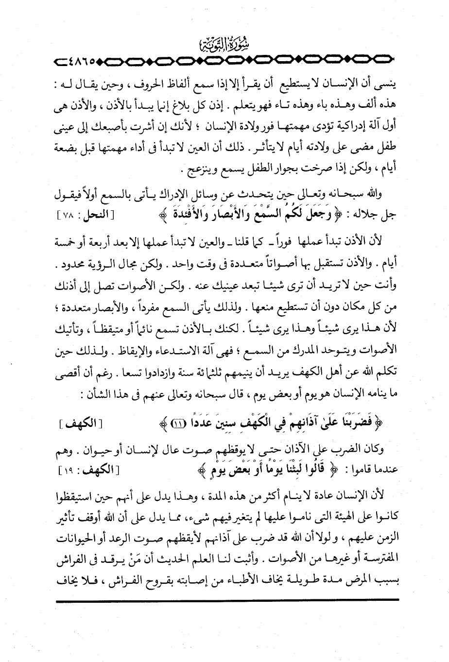 ينسى أن الإنسان لا يستطيع أن يقرأ إلا إذا سمع ألفاظ الحروف، وحين يقال له: هذه ألف وهذه باء وهذه تاء فهو يتعلم. إذن كل بلاغ إنما يبدأ بالأذن، والأذن هي أول آلة إدراكية تؤدي مهمتها فور ولادة الإنسان؛ لأنك إن أشرت بأصبعك إلى عيني طفل مضى على ولادته أيام لا يتأثر. ذلك أن العين لا تبدأ في أداء مهمتها قبل بضعة أيام، ولكن إذا صرخت بجوار الطفل يسمع وينزعج.