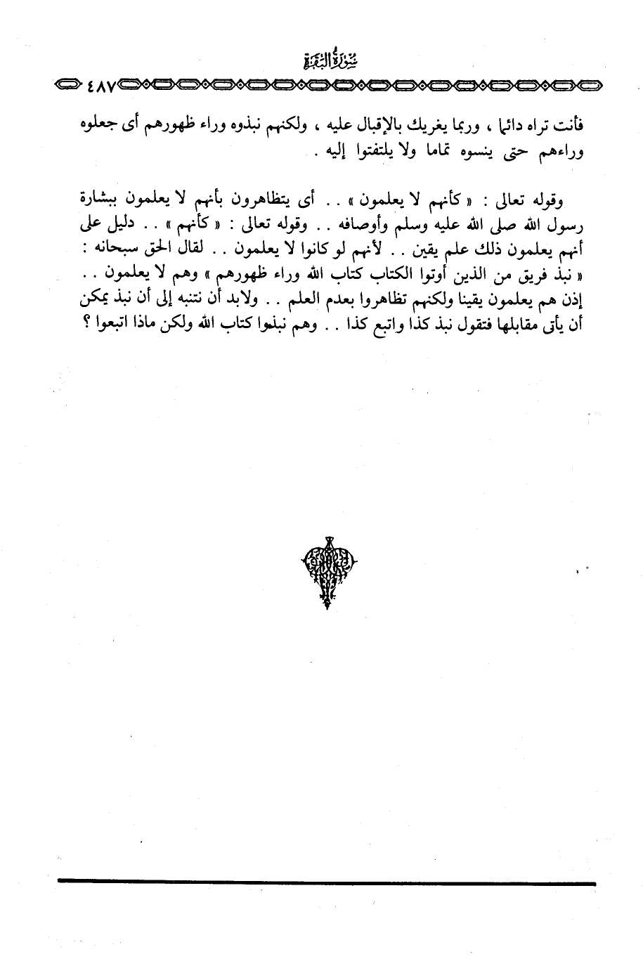 وقوله تعالى: {كَأَنَّهُمْ لاَ يَعْلَمُونَ} . . أي يتظاهرون بأنهم لا يعلمون ببشارة رسول الله صَلَّى اللَّهُ عَلَيْهِ وَسَلَّم َ وأوصافه. . وقوله تعالى: «كأنهم» . . دليل على أنهم يعلمون ذلك علم يقين. . لأنهم لو كانوا لا يعلمون. . لقال الحق سبحانه: {نَبَذَ فَرِيقٌ مِّنَ الذين أُوتُواْ الكتاب كِتَابَ الله وَرَآءَ ظُهُورِهِمْ} وهم لا يعلمون. . إذن هم يعلمون يقينا ولكنهم تظاهروا بعدم العلم. . ولابد أن نتنبه إلى أن نبذ يمكن أن يأتي مقابلها فنقول نبذ كذا واتبع كذا. . وهم نبذوا كتاب الله ولكن ماذا اتبعوا؟